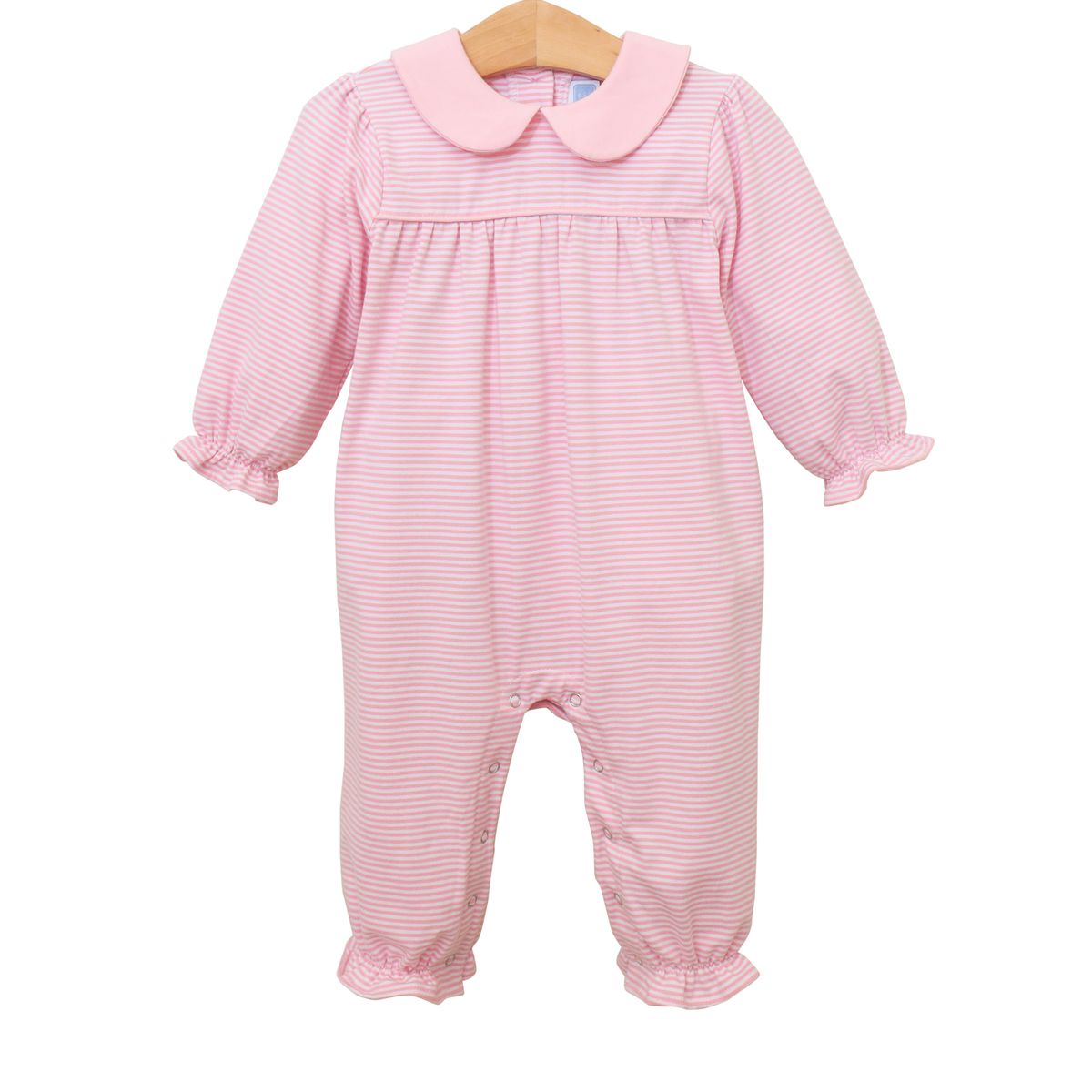 Soft knit and a sweet peter pan collar makes this romper a go-to for everyday comfort. The light pink stripe pattern, gentle gathers, and practical snap closures keep your little one cozy and make changes a breeze.