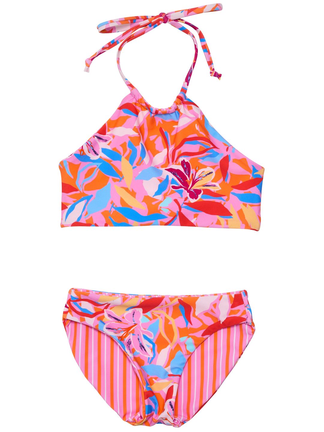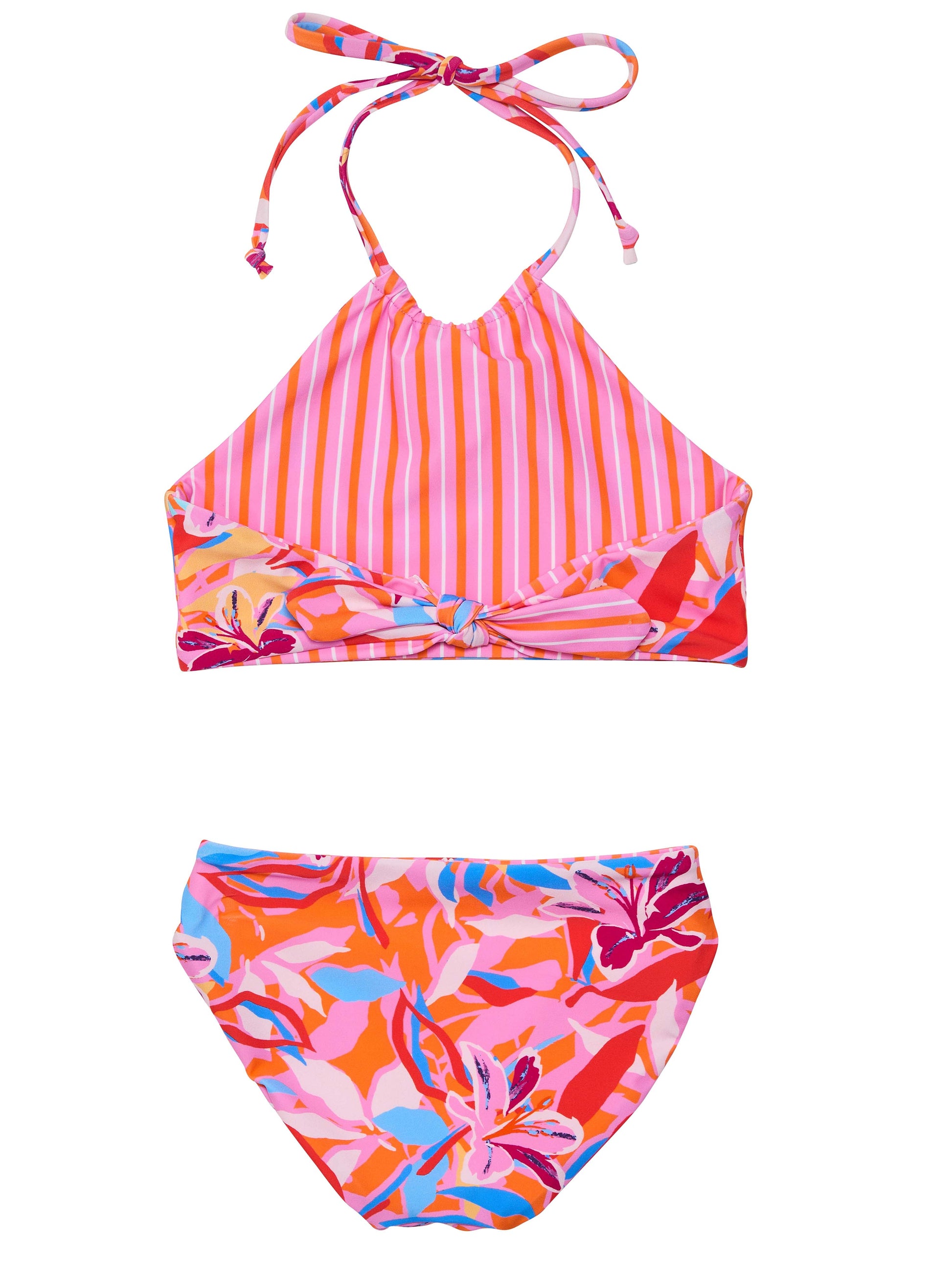 Flip between two beach-ready styles with this reversible halter bikini top and bottoms, flaunting a lush tropical print on one side and soft pink and coral stripes on the other. It's designed with a neck and back tie for an adjustable fit and smooth, tie-free bottoms for sleek comfort, perfect for switching up your look on the fly.