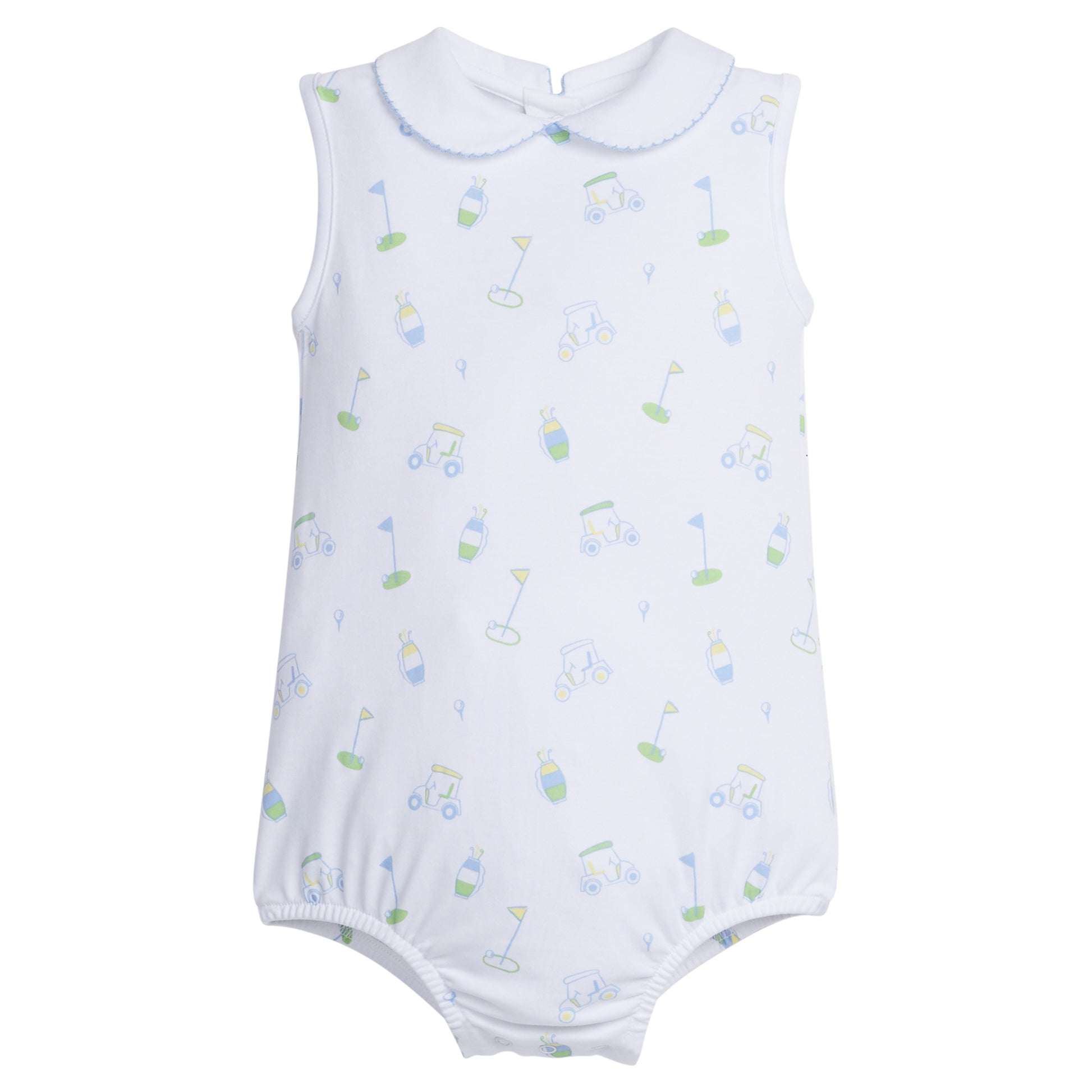 A classic look for your little one, the Blue Golf Peter Pan Bubble by Little English is perfect for sunny days and special outings. Featuring a charming golf-themed print with golf carts, flags, and clubs in soft pastel hues, this sleeveless bubble is both playful and timeless. The crisp white Peter Pan collar with delicate blue trim adds a polished touch, while elastic leg openings ensure a comfortable fit. Crafted from ultra-soft Pima cotton, this bubble is as cozy as it is adorable.