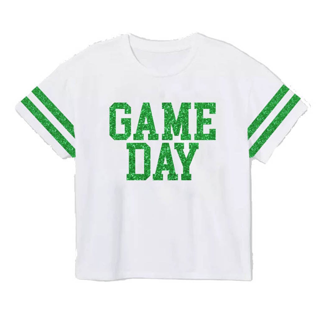 Get ready to shine in this vinyl glitter boxy Game Day shirt! This green and white shirt is perfect for game days and is made from a comfortable blend of cotton and spandex. The vinyl glitter adds a touch of sparkle to show off your team spirit. Look and feel amazing while cheering on your team!