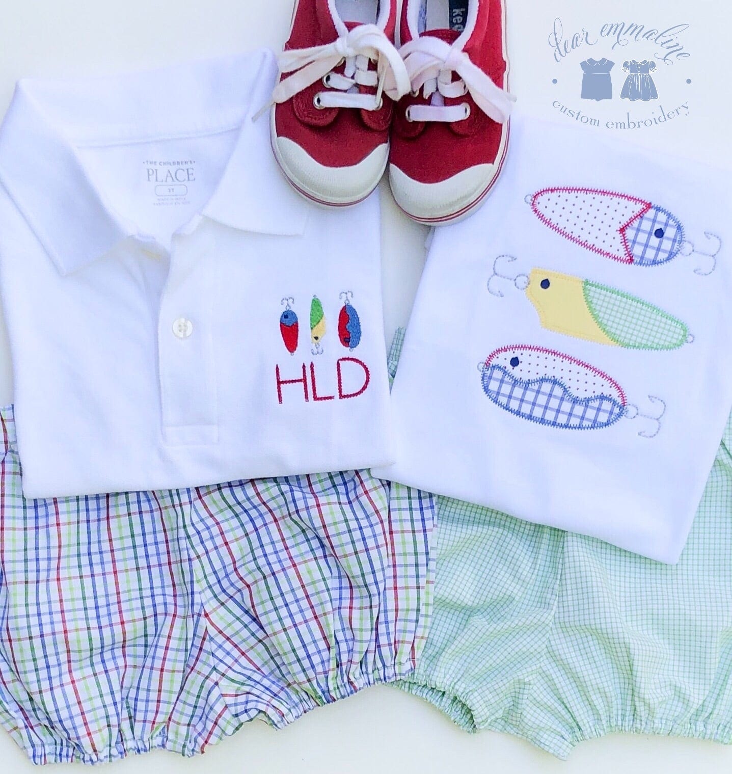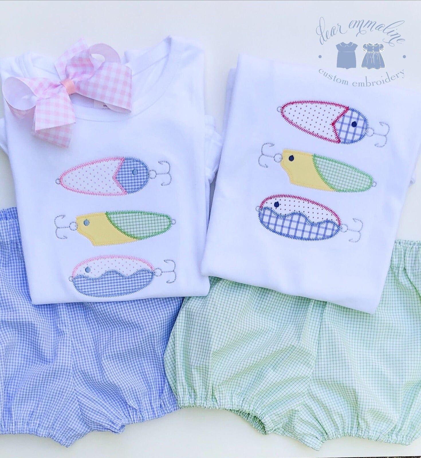 He'll be ready for some summer fishing fun in this Fishing Lure Shirt. Be sure to grab the brother and sister matches for a sweet sibling set! We love this shirt with our Primary Plaid and Green Mini Windowpane bottoms.