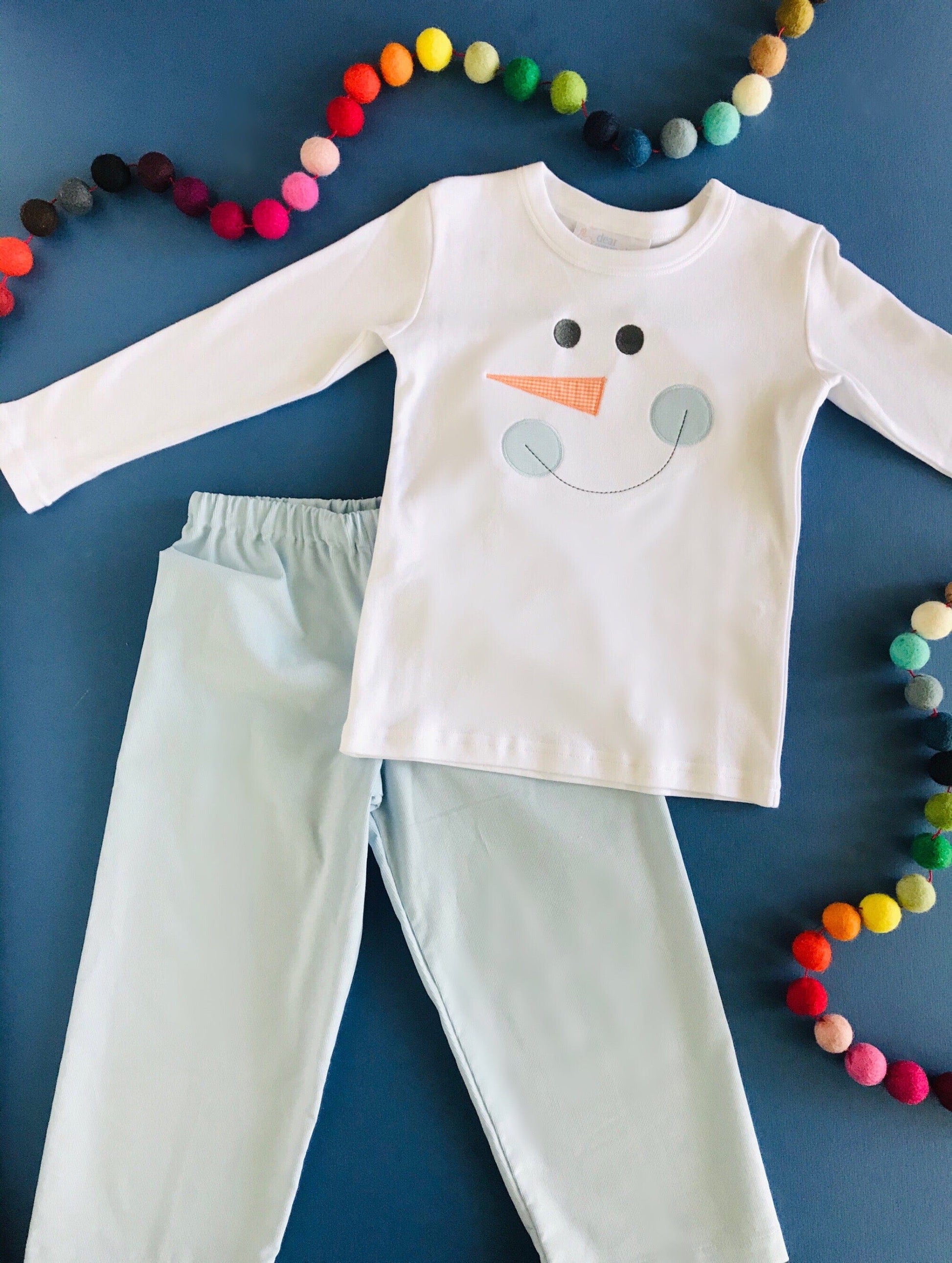 Have you ever seen a happier snowman? We especially love this one paired with our Light Blue Corduroy bottoms for wear all winter long!