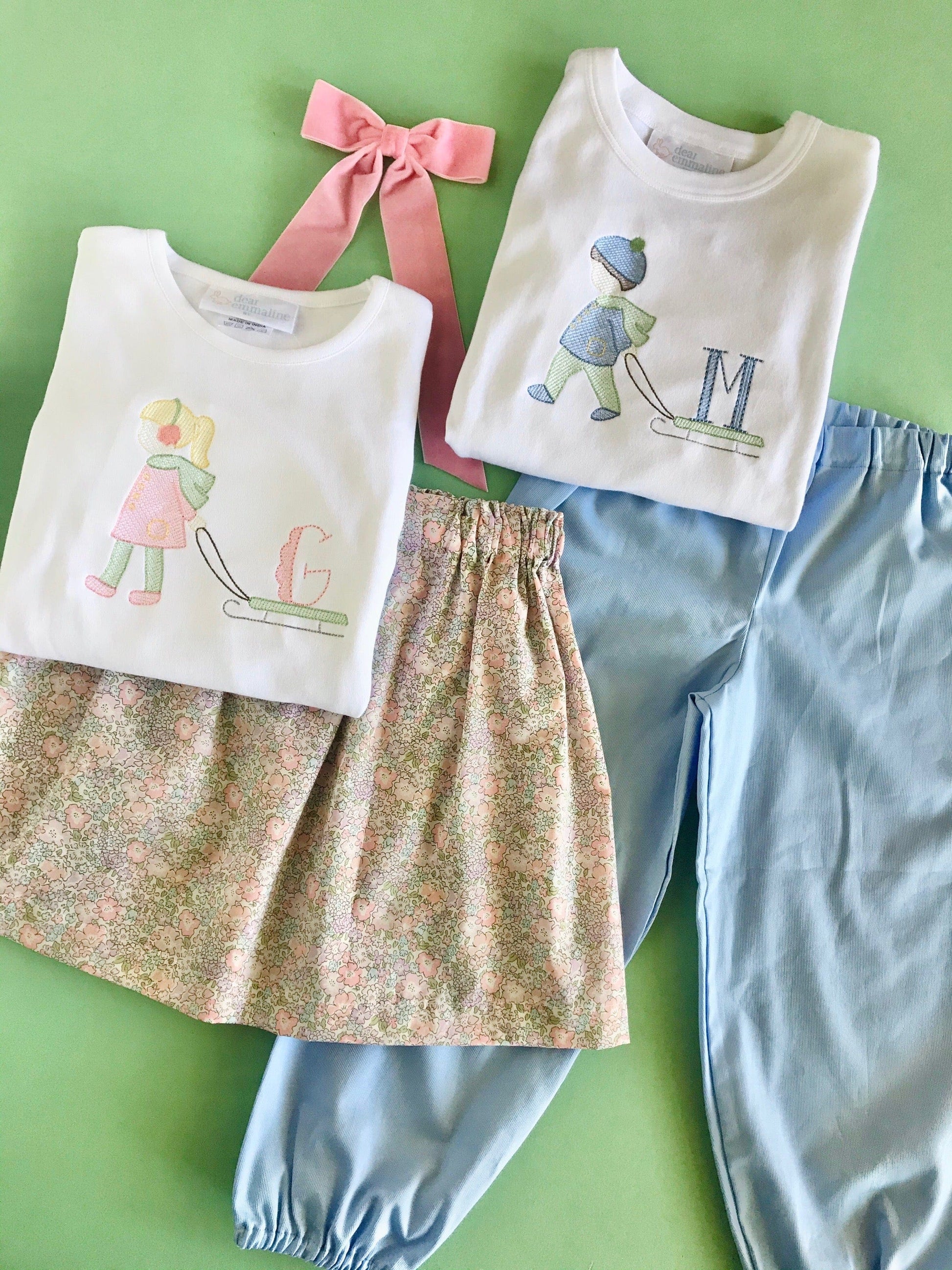 This Sled shirt will be one of his winter favorites! Be sure to list the initial for your sled in the Item Notes! We love this shirt with a variety of our fabrics, Light Blue Gingham, Cornflower Blue Corduroy, and Sage Gingham.