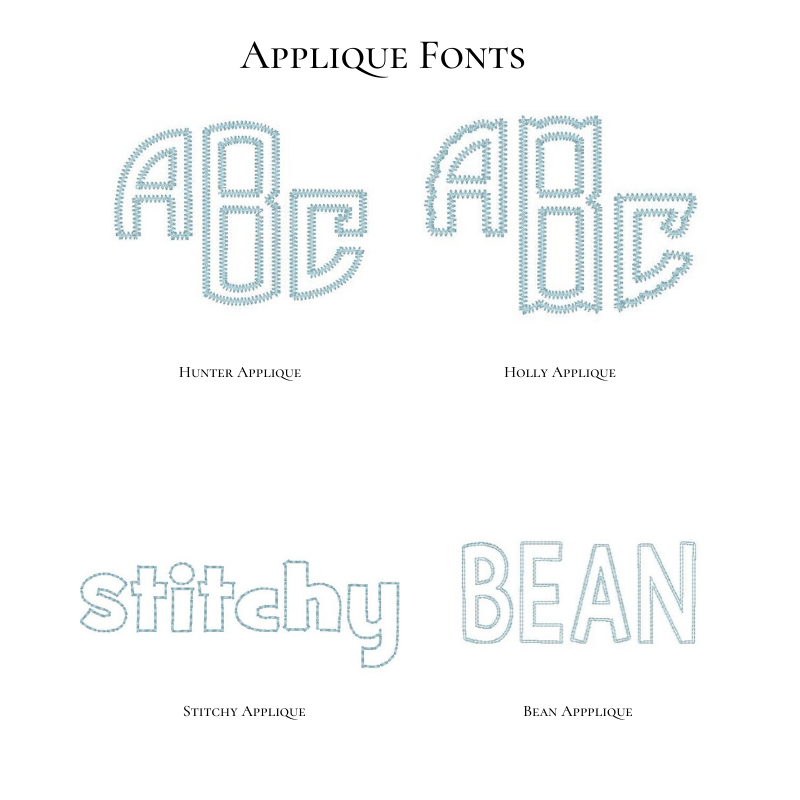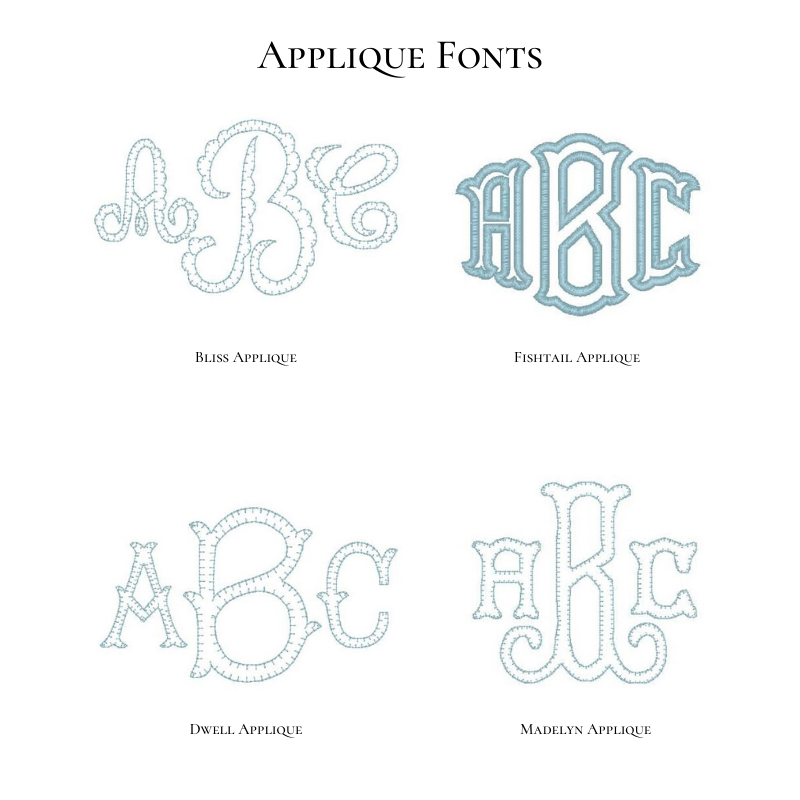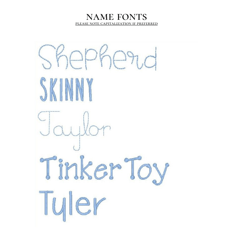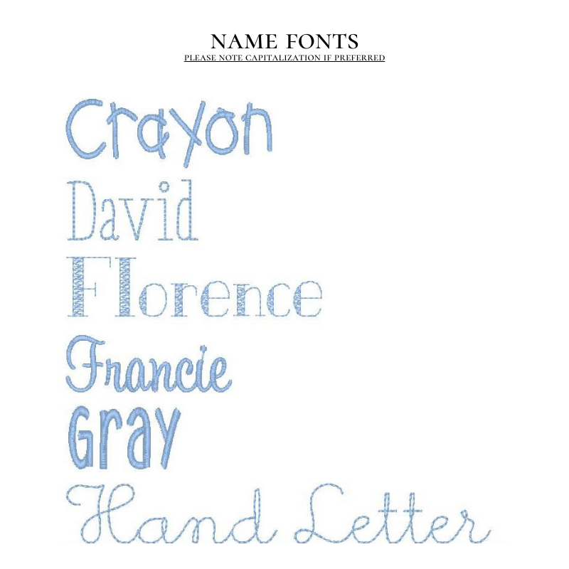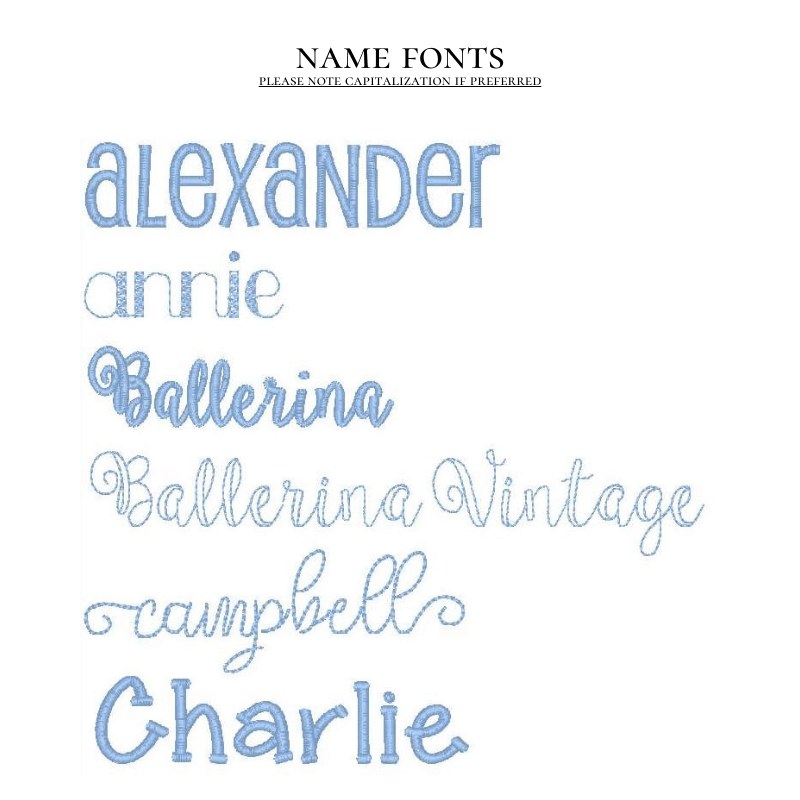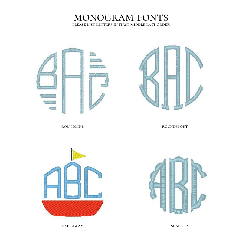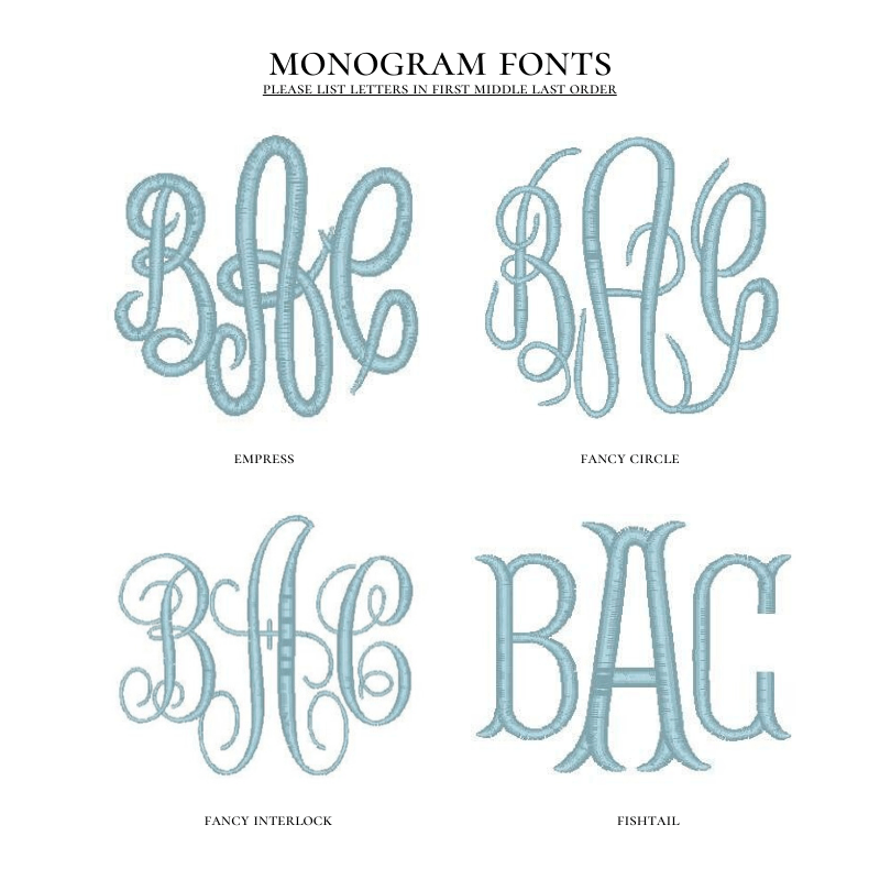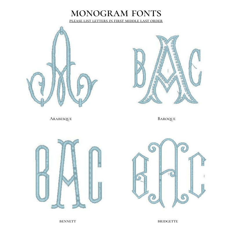 When adding a name or monogram, please specify the font in the Item Notes section. When adding a monogram, please list the initials in First Middle Last order. For example, Sarah Elizabeth Johnson would be listed as S E J. Dear Emmaline is not responsible for incorrect monograms when stitched as listed in Item Notes.