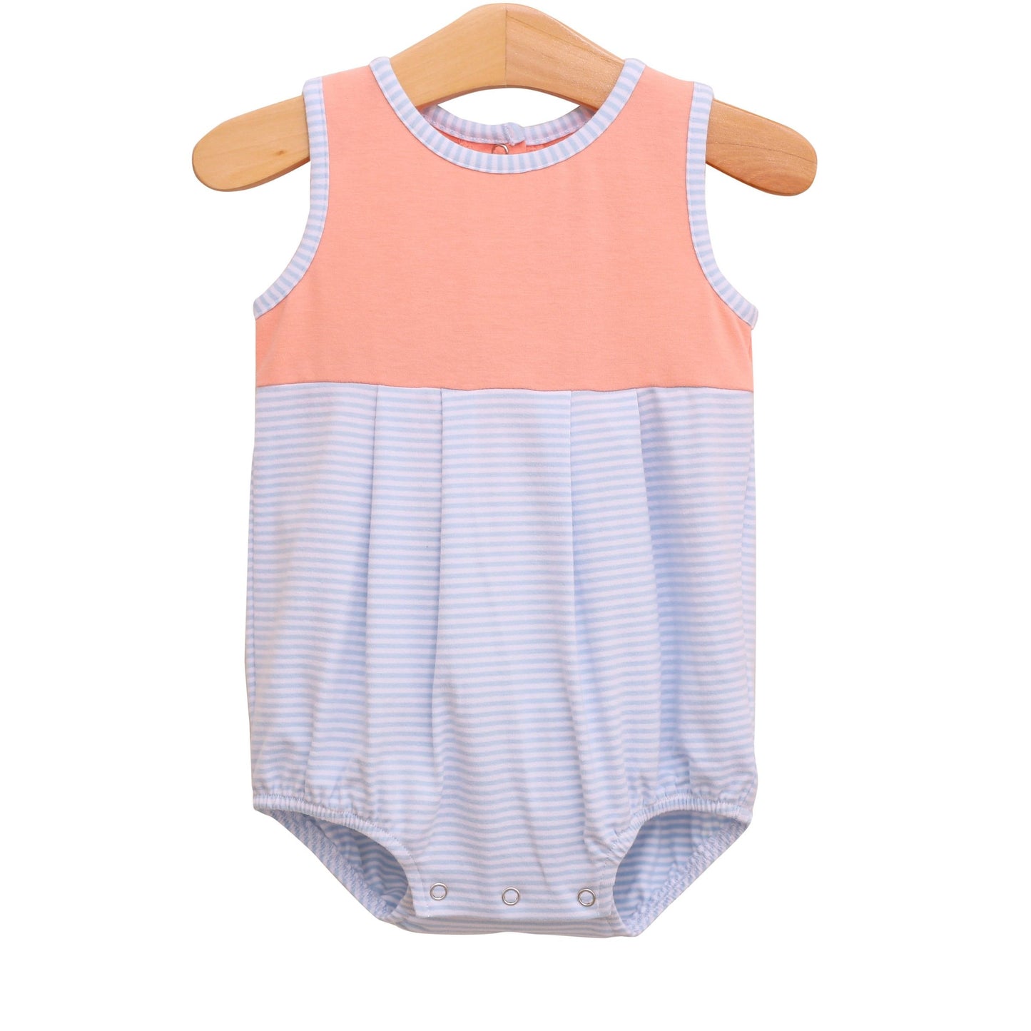 A cheerful summer favorite! This sleeveless bubble features a coral knit bodice with a light blue mini stripe bottom. Snaps at the bottom make diaper changes a breeze, and the soft knit ensures all-day comfort.