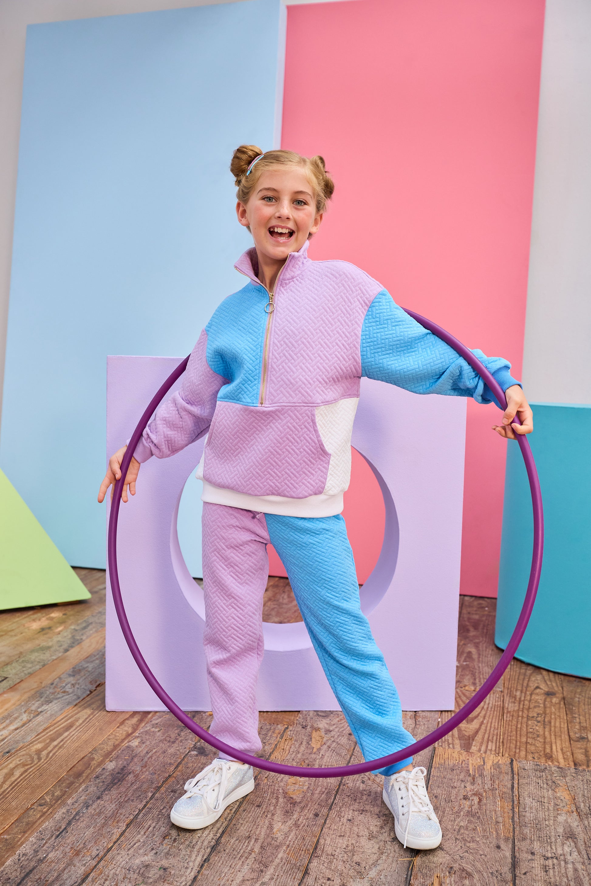 A Bisby favorite is back! This best-selling set brings a pop of color to chilly days with its bold colorblock design and soft quilted trellis fabric. The pullover features a gold half-zip and relaxed fit for easy layering, while the joggers have a comfy elastic waist and tapered leg. Available in two vibrant combos—Lavender/Blue and Pink/Cranberry—these separates mix and match effortlessly for a look that’s as fun as it is cozy. Sold separately so she can style her way, but just as perfect worn together.