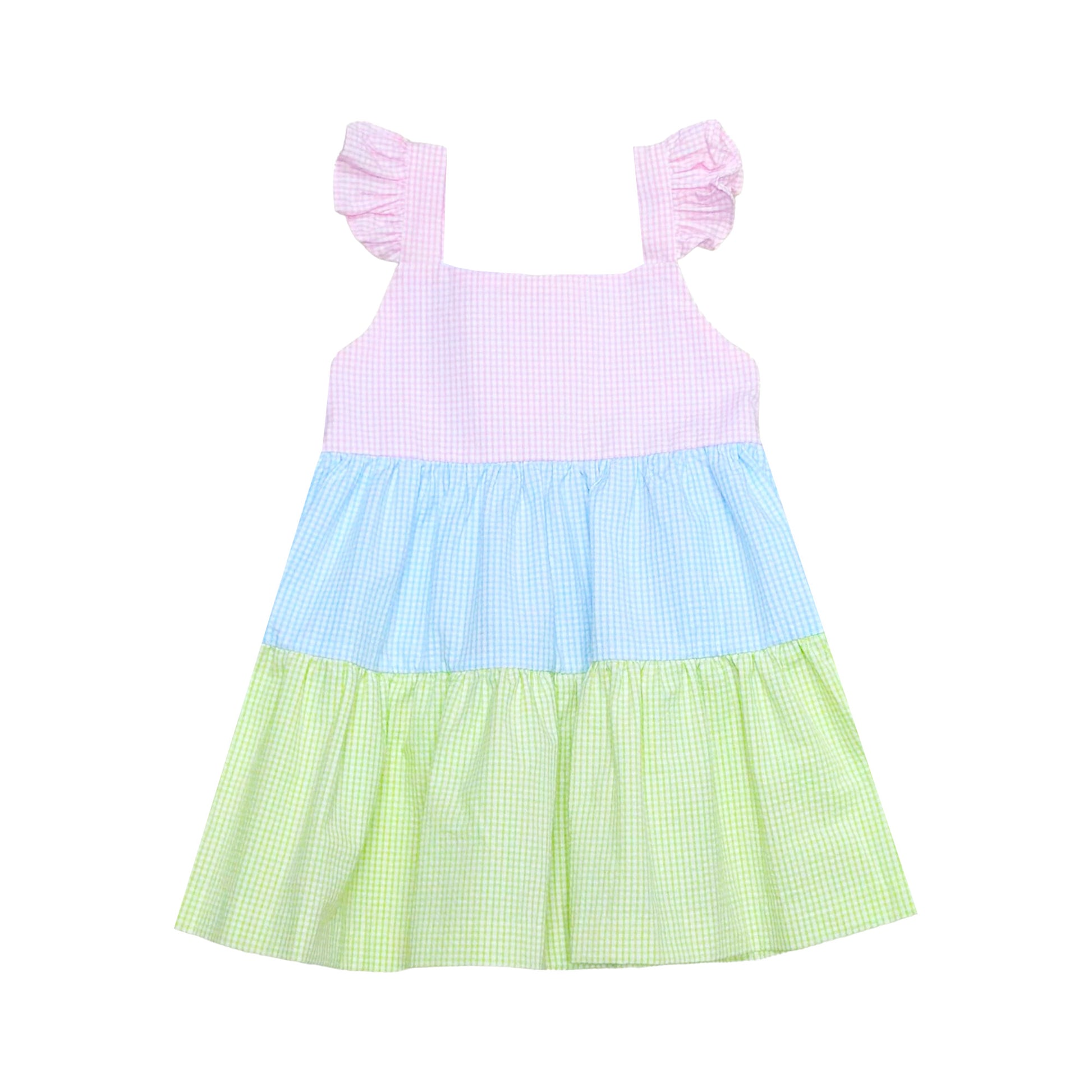 Bright, breezy, and full of charm—this tiered sundress features pastel gingham panels in pink, blue, and green, complete with flutter sleeves for a playful finish. A go-to dress for garden parties, beach strolls, or just soaking in the sunshine.