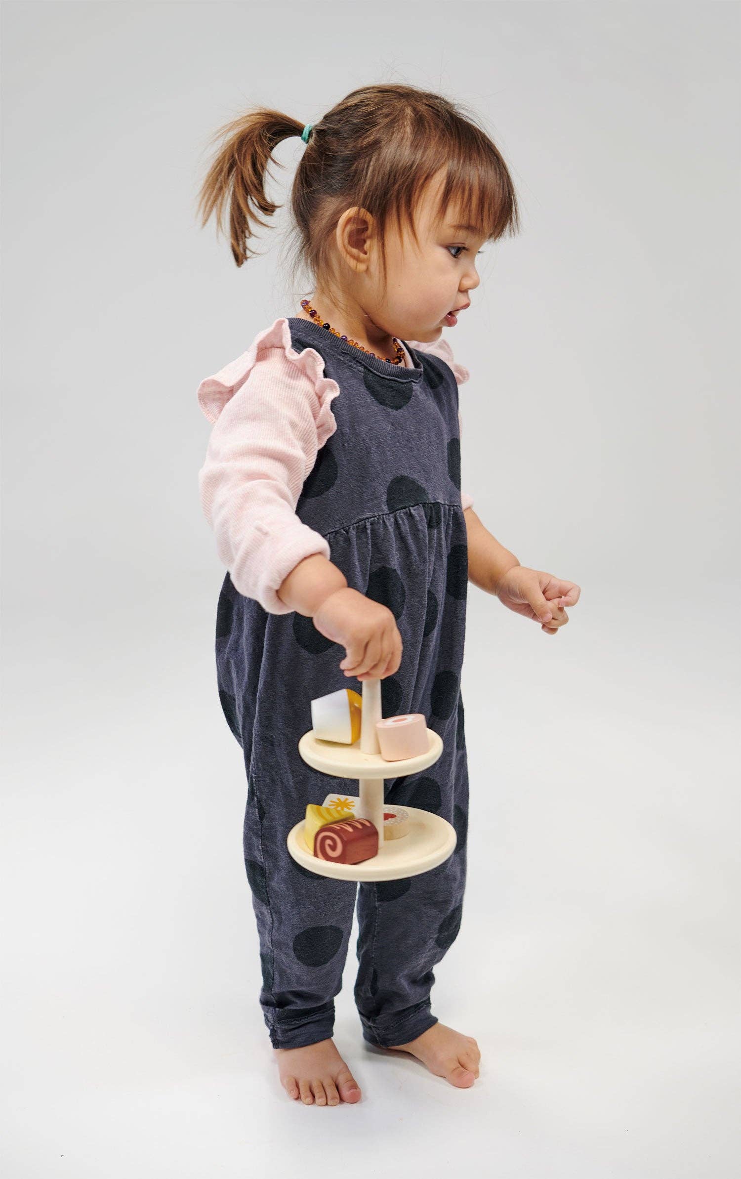 This wooden tea party stand includes a two-tier cake stand and 7 tea party fancies.