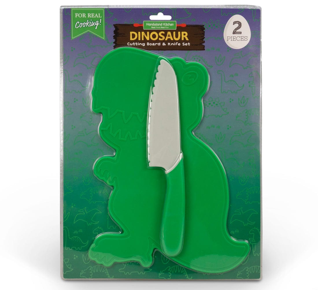Includes: 1 medium (10.5”) serrated knife and 1 dinosaur-shaped cutting board (approx. 8.75”W x 11.75” L).