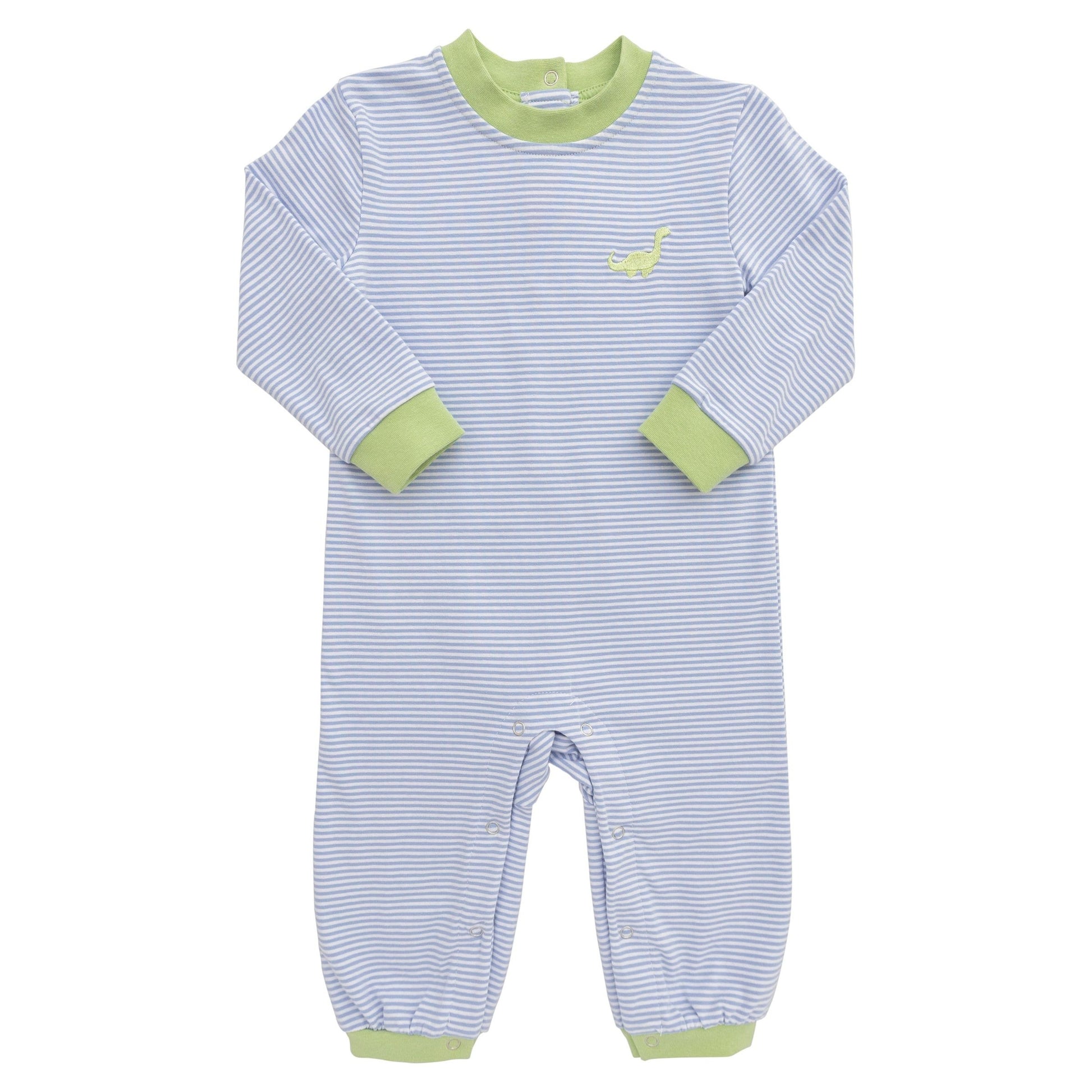 Made for all-day comfort, this knit romper features classic blue and white stripes with bright green trim and a cheerful dinosaur embroidery. Snaps along the inseam make changes quick and easy.