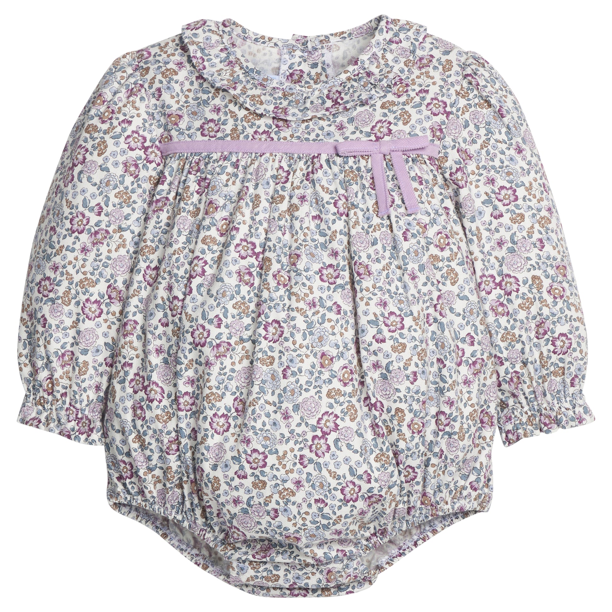 Sweet and classic, the Emma Bubble in Margaux Floral is a timeless choice for baby girls. Featuring a delicate lavender, blush, and blue floral print, ruffled collar, and a soft lavender bow detail, it’s perfect for special occasions or everyday charm. Snap closures make dressing easy.