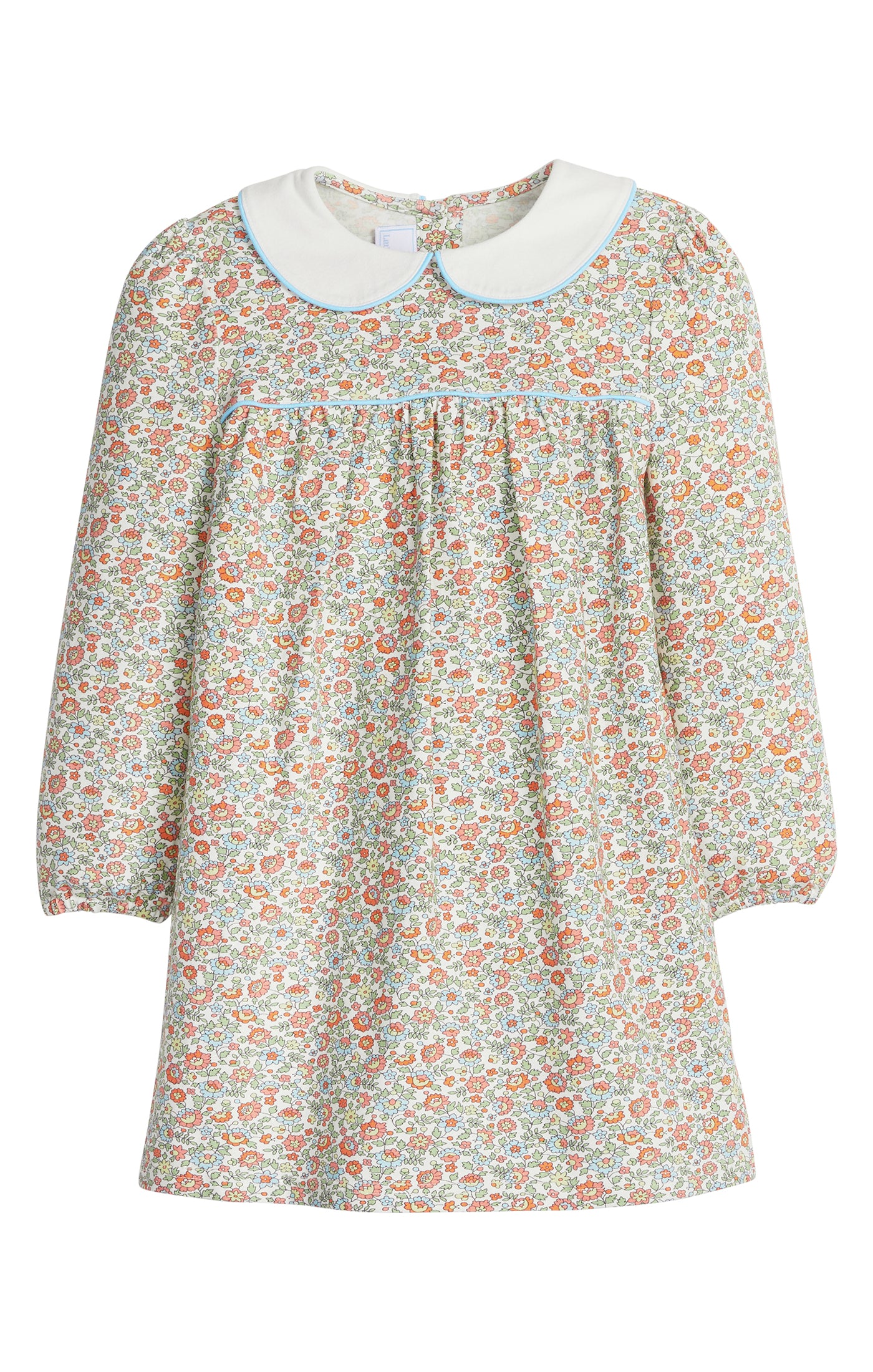 The Long Sleeve Dress is as sweet as it is timeless, featuring a delicate floral print, peter pan collar with baby blue piping, and gathered front detailing. A classic choice for school pictures, church, or special fall outings.
