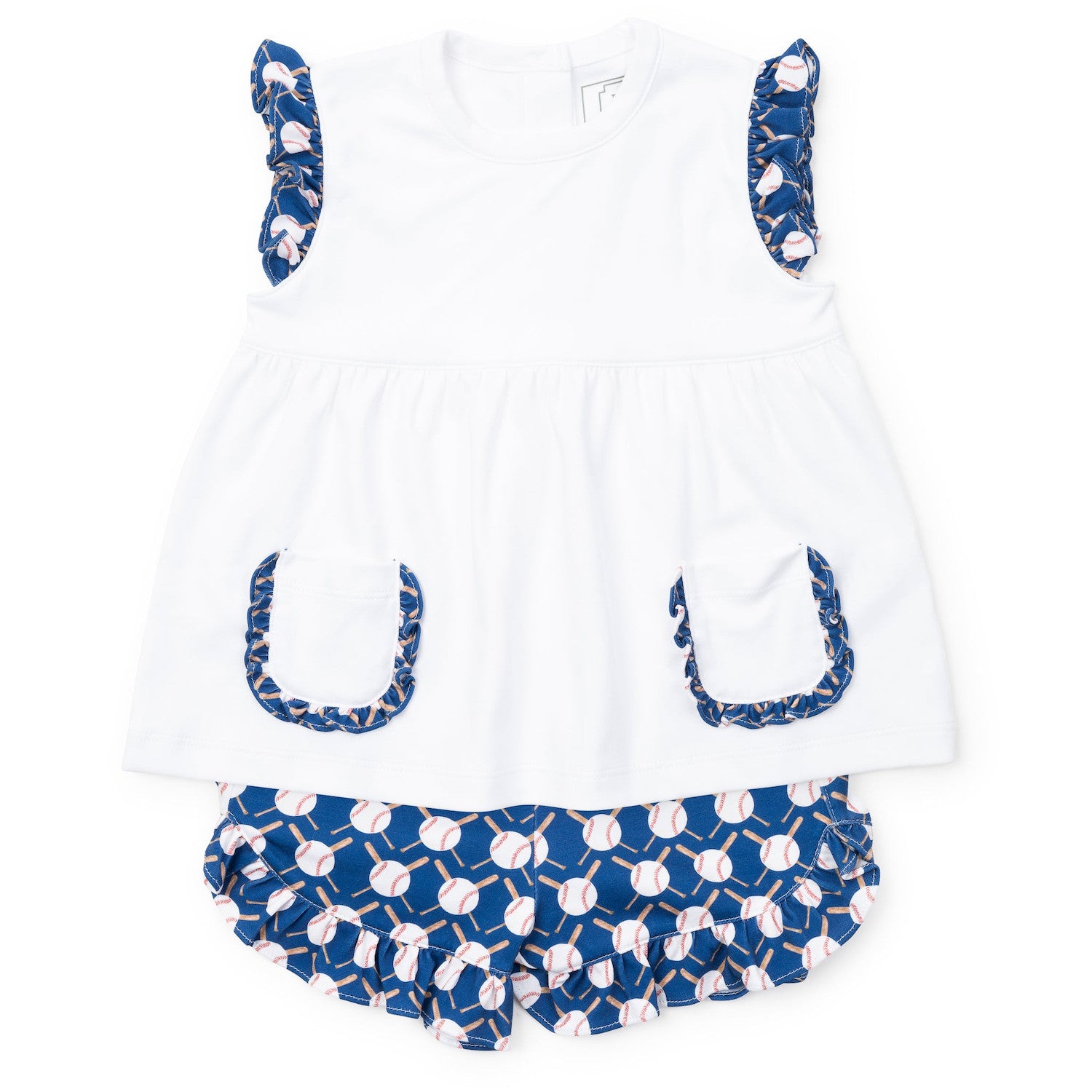 Girls' pima cotton flutter sleeve shirt with ruffled front pockets and matching ruffled shorts. Made from 100% Peruvian Cotton