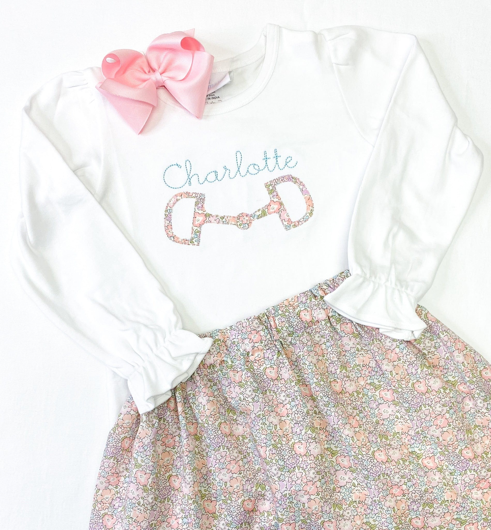 Such a classic girls applique shirt in the sweetest Liberty fabric. Order as is, or customize with another favorite fabric. Shown here with our Michelle E Liberty of London skirt.