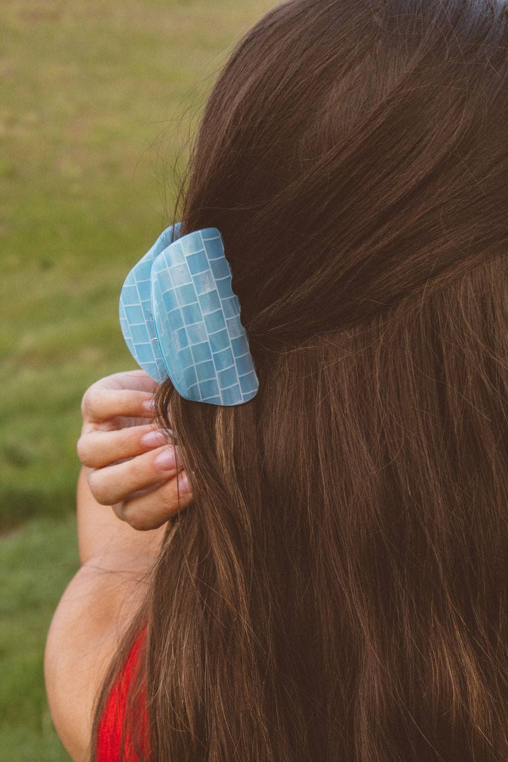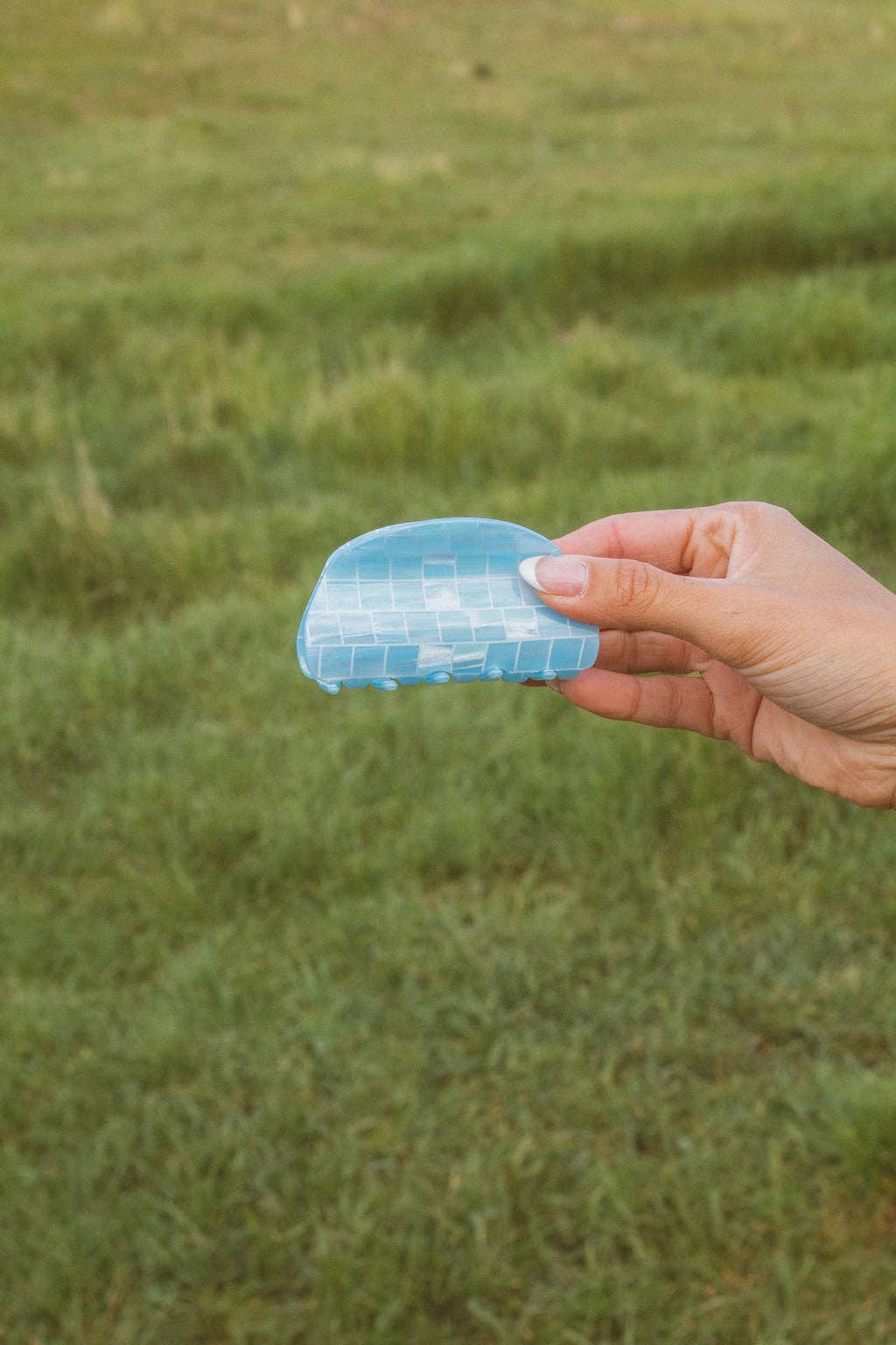 This darling half moon shaped claw clip is so perfect and festive for the 4th of July! It comes in the perfect pearly white, and an iridescent blue made in a high quality acetate material. The best way to elevate your updo for the day. This is a medium 3 inch claw clip.