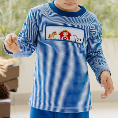 Farm smocking meets cozy comfort in this stripe long-sleeve tee, ready for preschool or playdates.