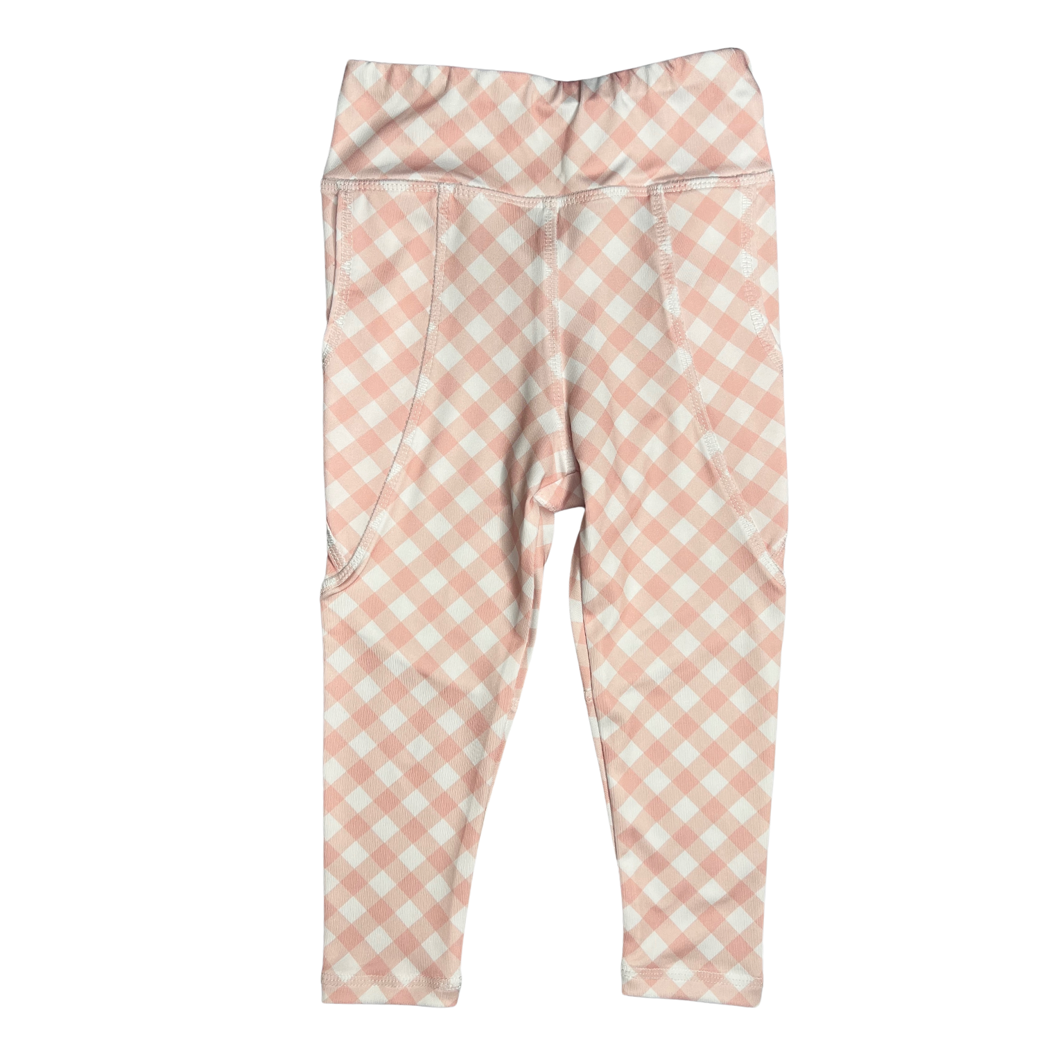 Classic meets playful in these coral pink gingham leggings. Stretchy, comfortable, and perfect for pairing with sweaters or tees.