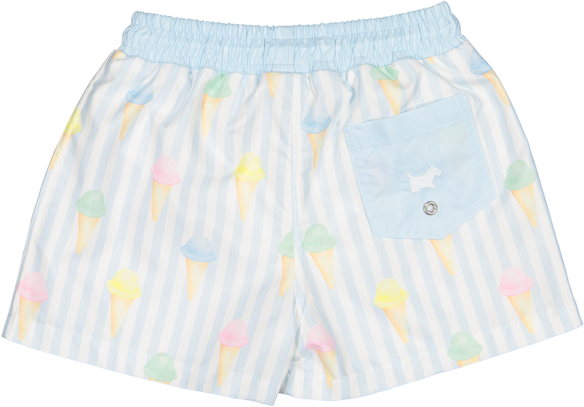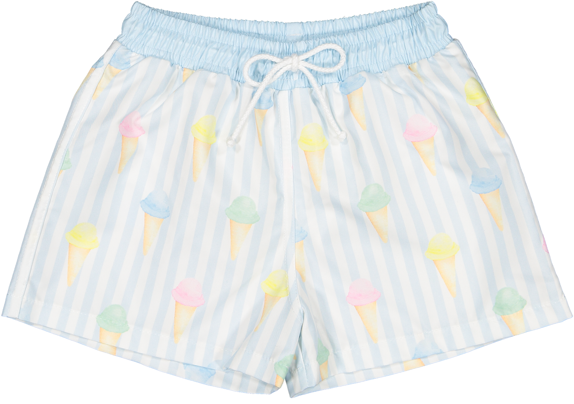 These Sal & Pimenta Ice Cream Swim Trunks are a fun and stylish choice for sunny beach days and poolside adventures. Featuring a charming pastel ice cream cone print over soft blue and white stripes, these swim trunks bring a playful yet classic summer vibe.