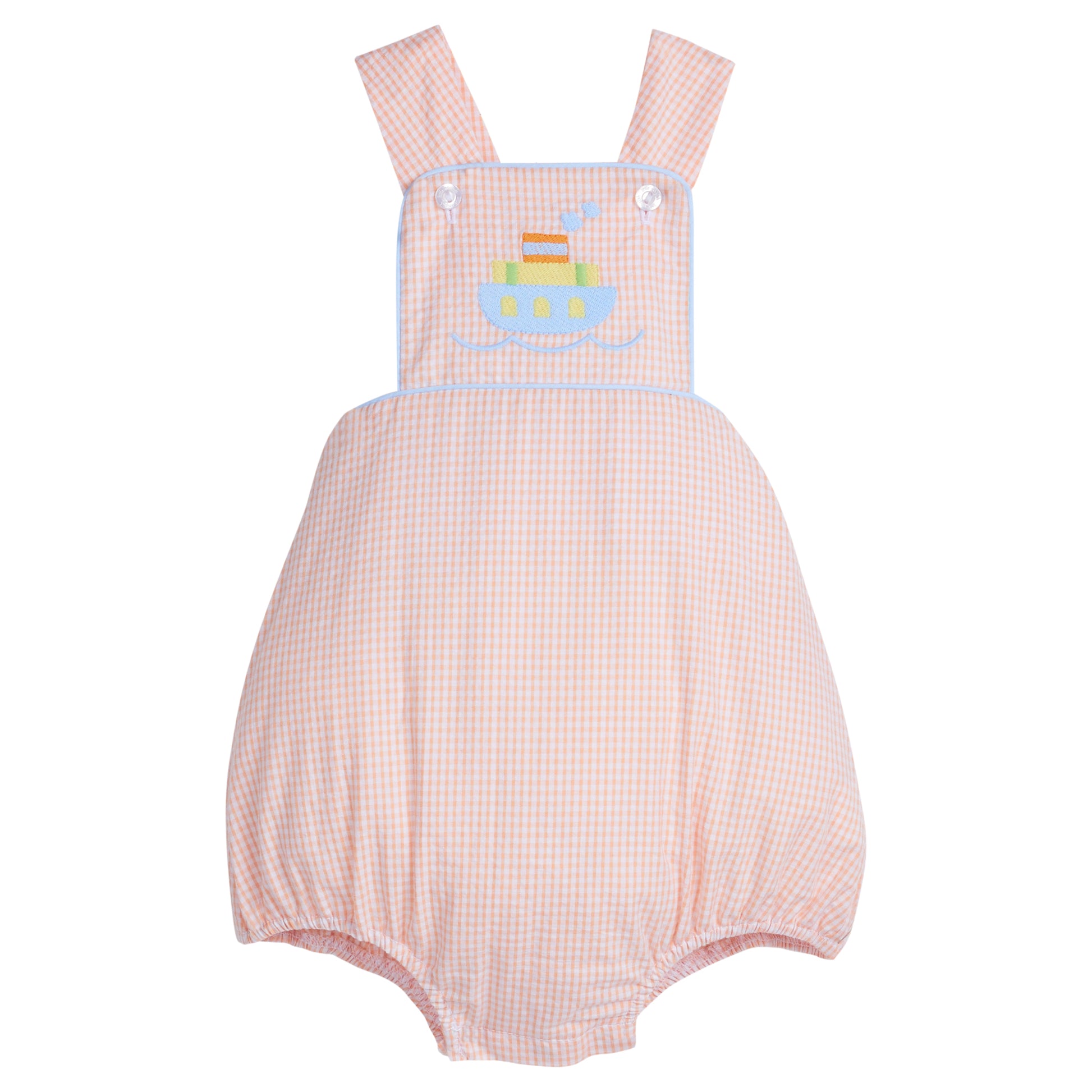 Set sail in style with the Linville Bubble in Tugboat by Little English! This charming bubble is made from soft peach gingham seersucker and features a classic bib-front design with a sweet appliqué tugboat detail. Blue piping accents the bib and straps, adding a timeless touch. Adjustable button straps and elastic leg openings ensure a comfortable fit, while snap closures make diaper changes a breeze. Perfect for warm-weather outings, beach trips, or family photos, this bubble is a must-have for little ones.