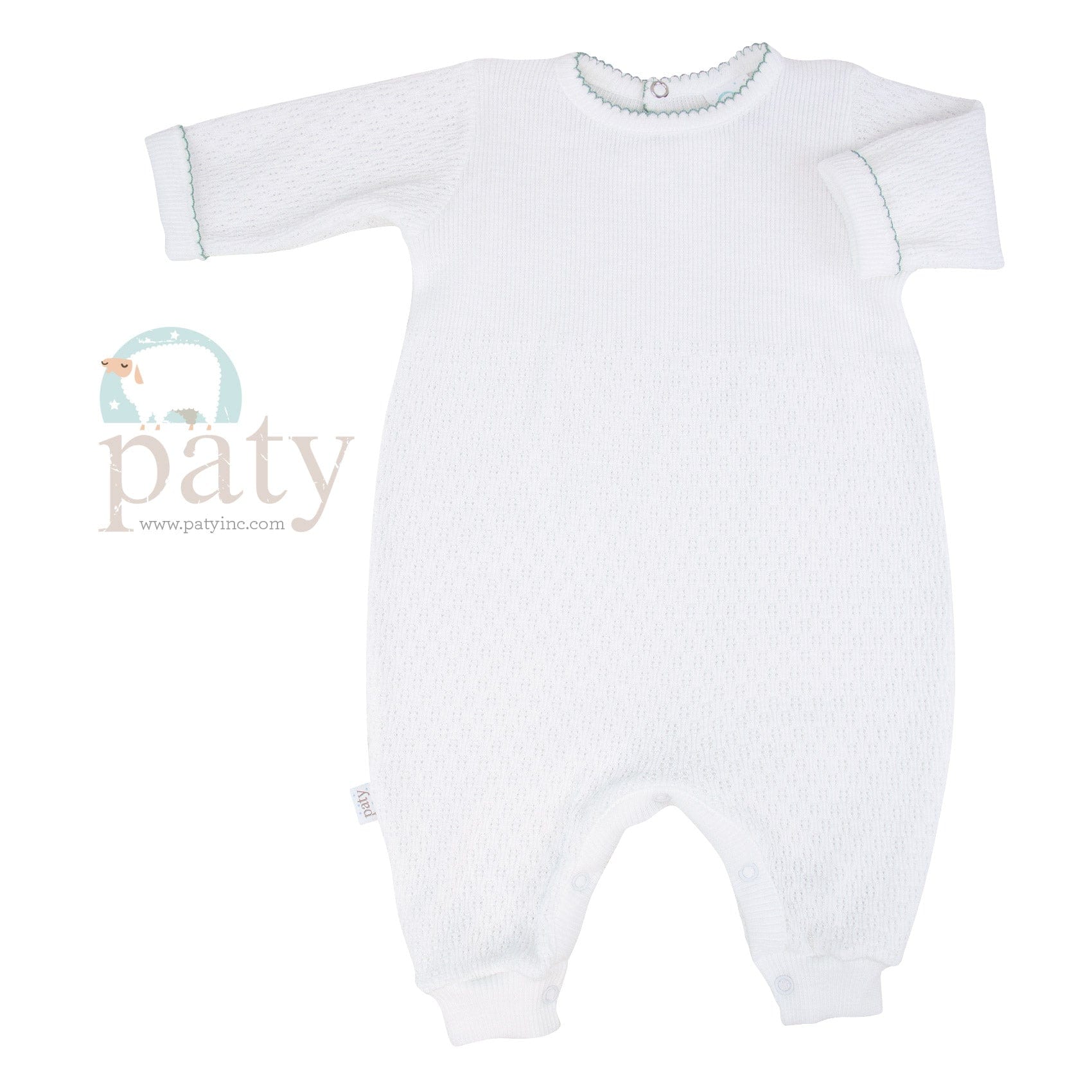 Classic Paty long sleeve romper with Light Blue Picot Trim