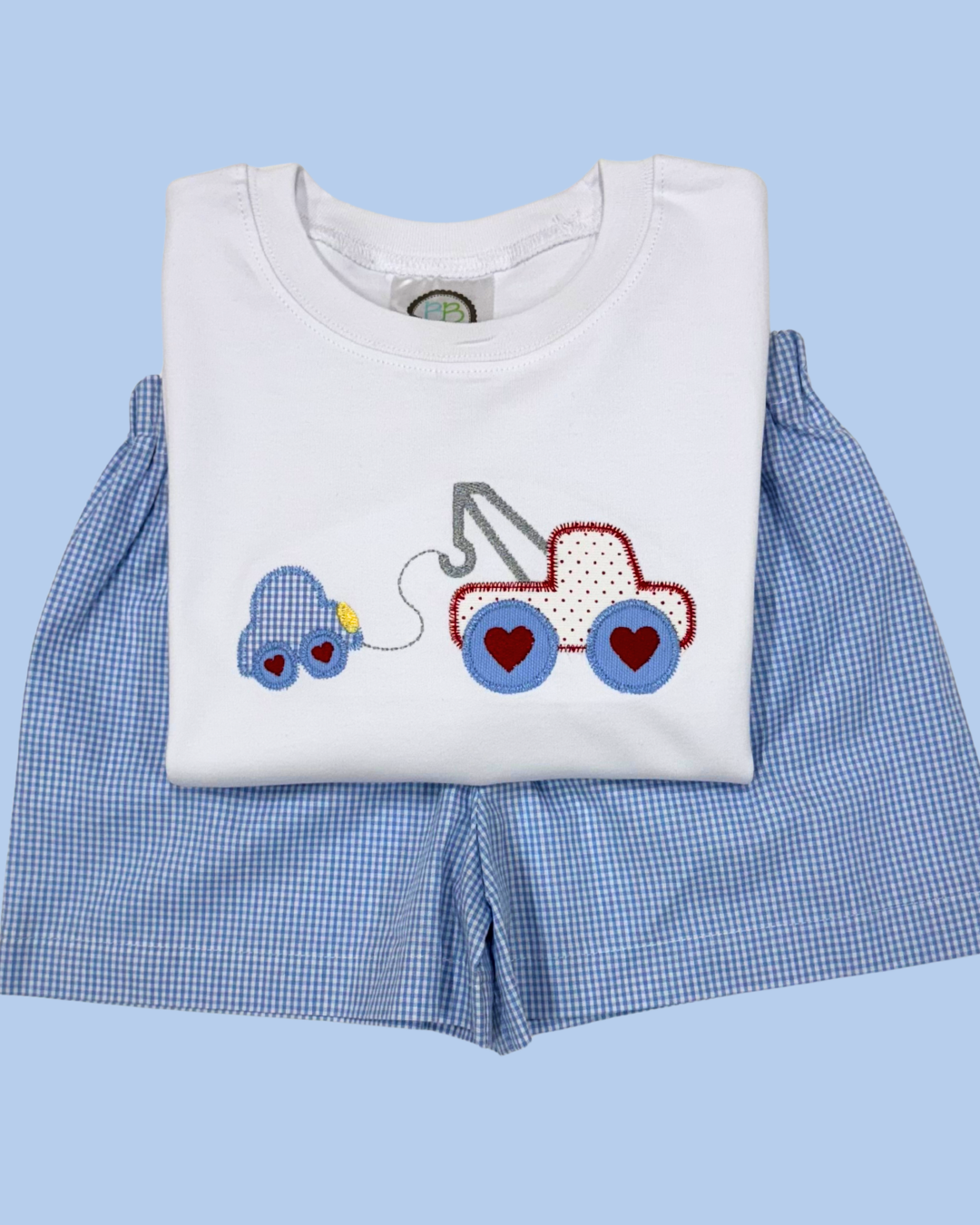 A playful tow truck pulling heart “cargo” for Valentine’s Day! Vintage-inspired stitching and darling red-heart wheels make this a precious choice for boys who love trucks. Add a name for the sweetest personalized touch.