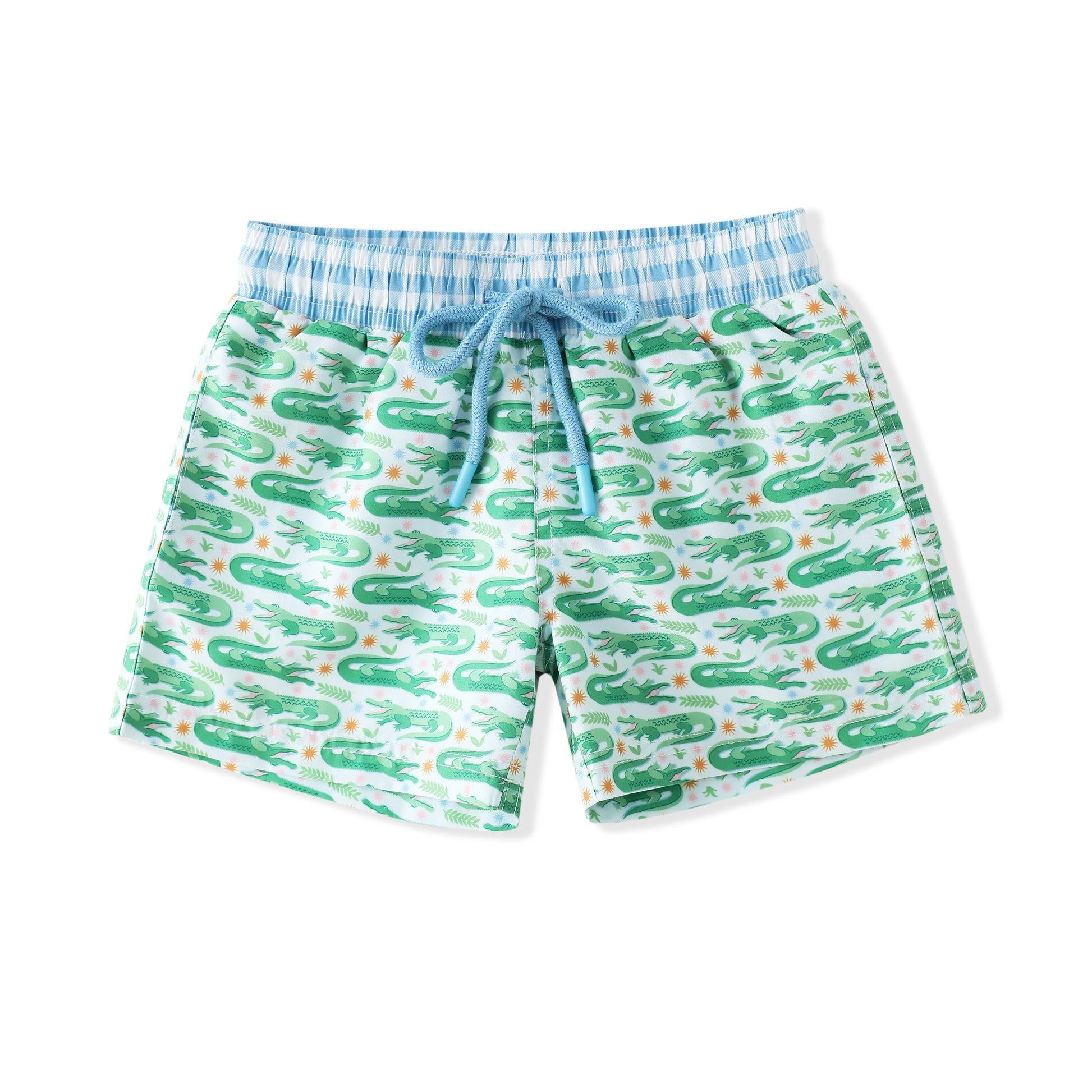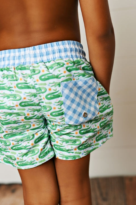 Make a splash with these fun alligator-print swim trunks, featuring a blue gingham waistband for a preppy touch. UPF 50 for added sun safety.