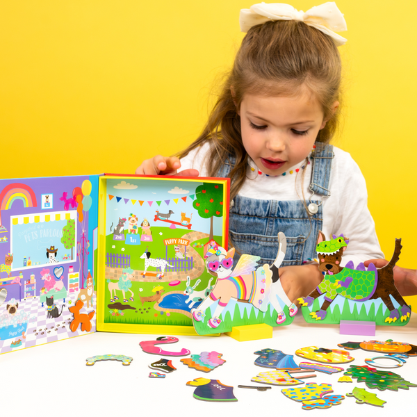 Paw-fect playtime fun with our Magnetic Dress Up Pets! The set comes with 2 magnetic pets - a playful pooch and a super cute cat, two wooden stands and over 90 magnetic outfit and play pieces to mix and match. The reusable box doubles up as a backdrop, with a pets parlour and a fun outdoor play scene. Accessorize the pets parlour by adding magnetic accessories! The lovely reusable box comes with a magnetic closure and keeps all parts safe for next time!