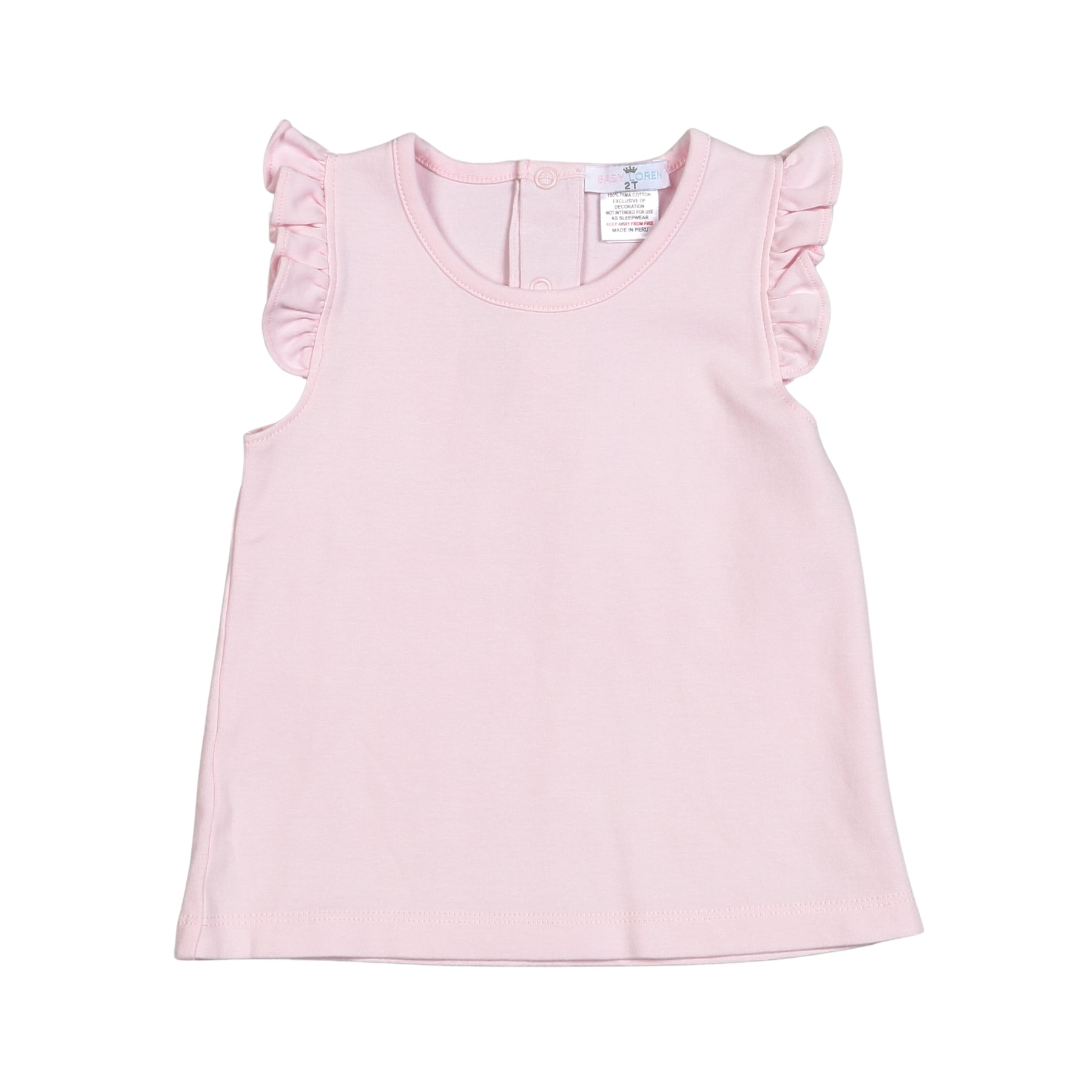 A soft and classic essential, the Pink Bubble Buddies Pima Cotton Top by Baby Loren is perfect for everyday wear! Crafted from ultra-soft and breathable Pima cotton, this sleeveless top is designed for all-day comfort. The delicate ruffle sleeves add a touch of sweetness, while the back snap closure ensures easy dressing. Whether paired with bloomers, shorts, or skirts, this versatile piece is a must-have in any little girl's wardrobe.