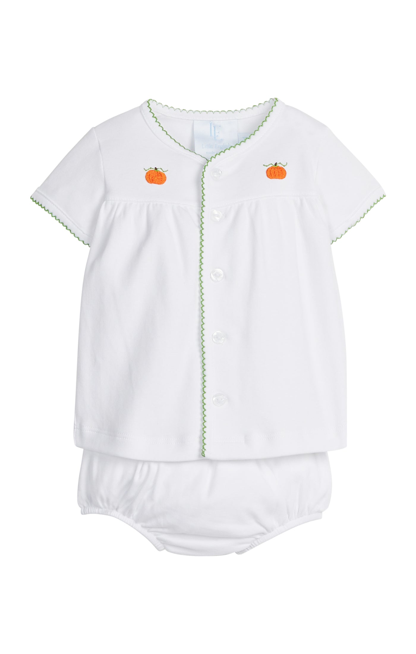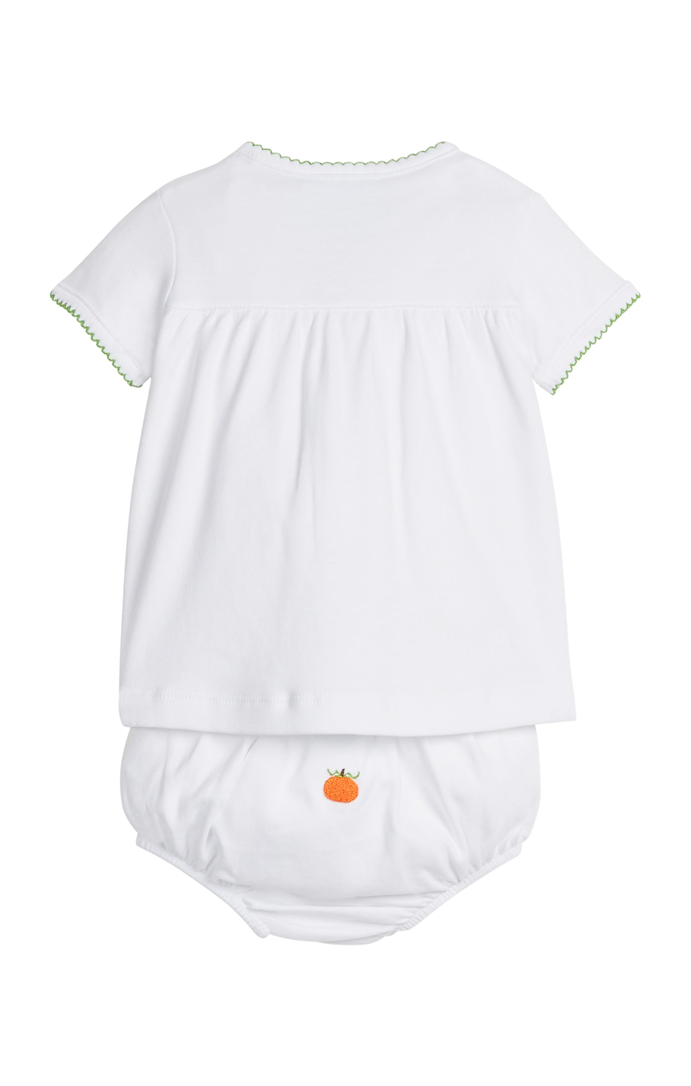 Made from the softest white pima cotton, this two-piece knit set is designed for the littlest ones. Sweet pumpkin embroidery at the neckline, green picot trim, and a tiny pumpkin detail on the back of the bloomers make this a thoughtful gift or everyday favorite.