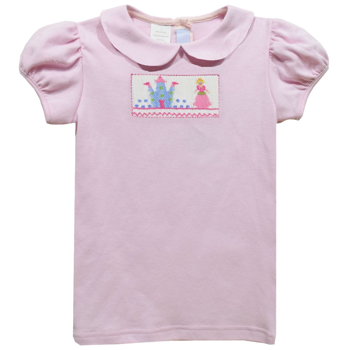 A charming pink top featuring a sweet smocked panel with a princess and castle design. Complete with puff sleeves and a peter pan collar, this top is perfect for imaginative play or everyday wear.