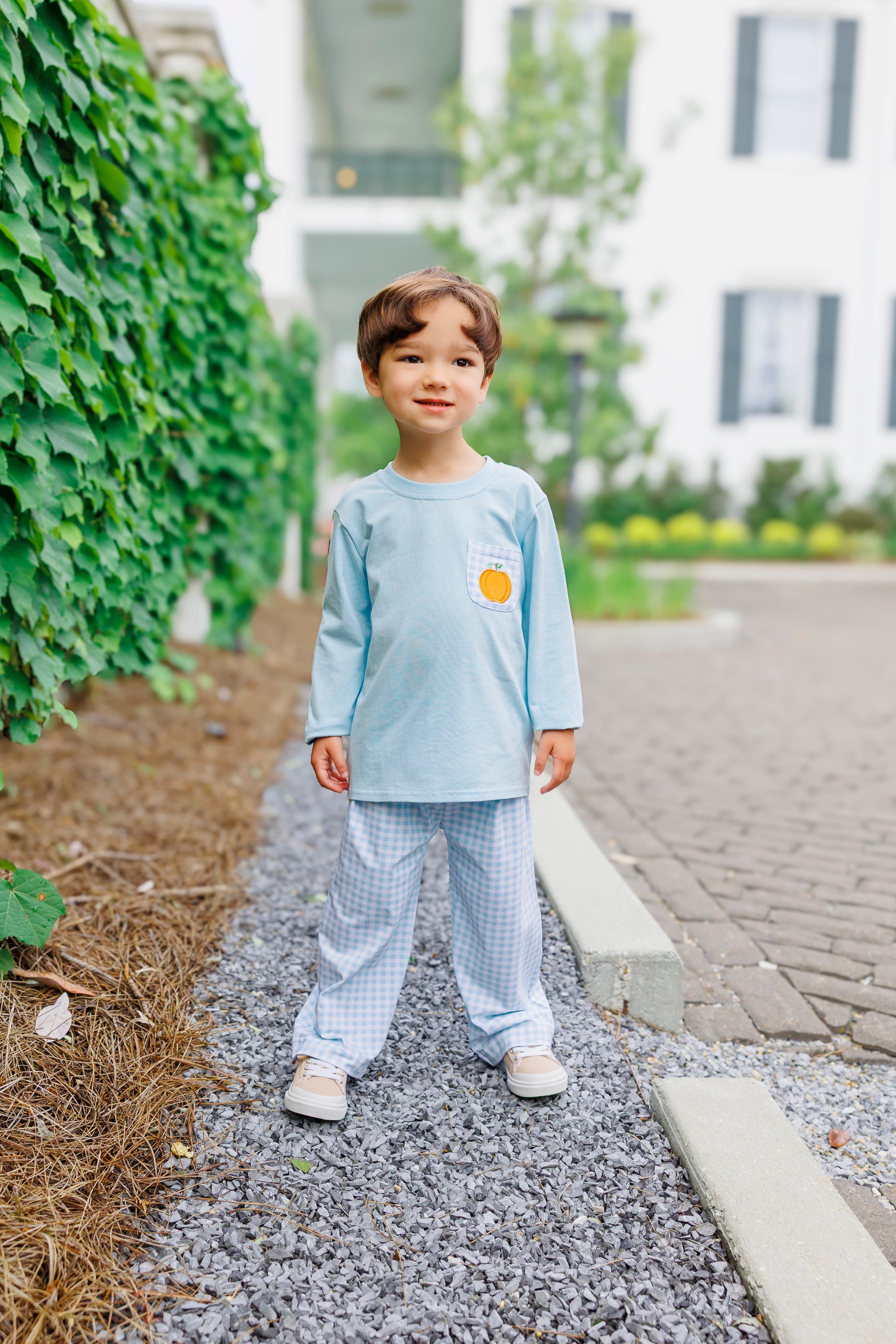 The perfect brother set for fall! A soft blue long sleeve top features a gingham pocket with pumpkin applique, paired with coordinating gingham pants. Comfortable, easy to wear, and full of seasonal style.