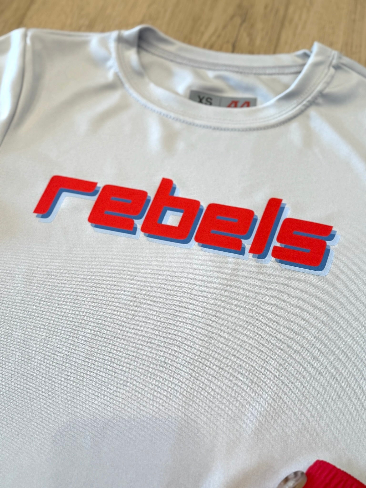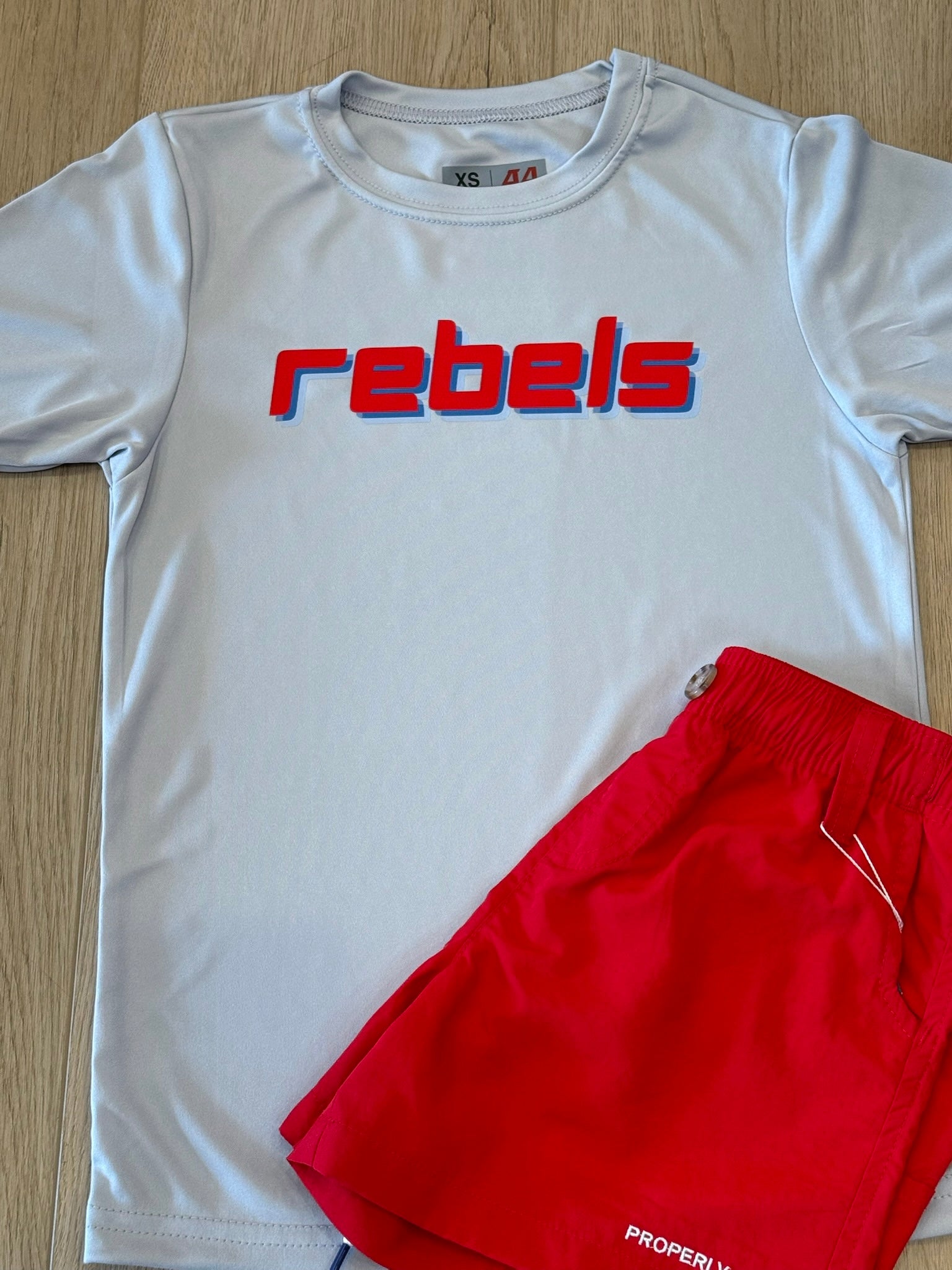 Game day ready! This sleek light gray performance tee is designed with a bold red and blue “rebels” graphic that pops with varsity style. The breathable, quick-drying fabric makes it perfect for hot Alabama days, while the athletic fit ensures all-day comfort. A versatile piece that pairs easily with shorts or joggers for an effortless Rebel look.
