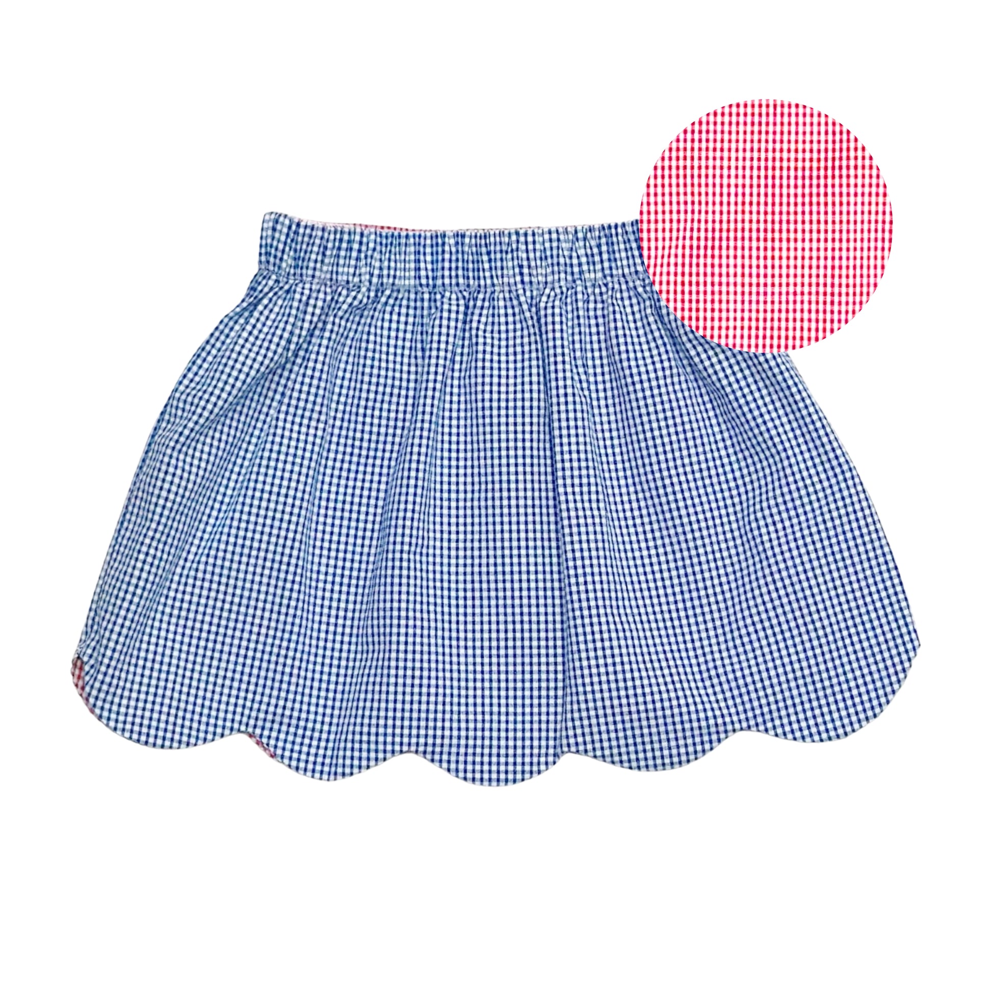 A timeless staple with a fun twist! This reversible skirt features a crisp royal blue mini gingham on one side and a vibrant red mini gingham on the other. The scalloped hem adds a sweet touch, making it a versatile must-have for everyday play and special outings.
