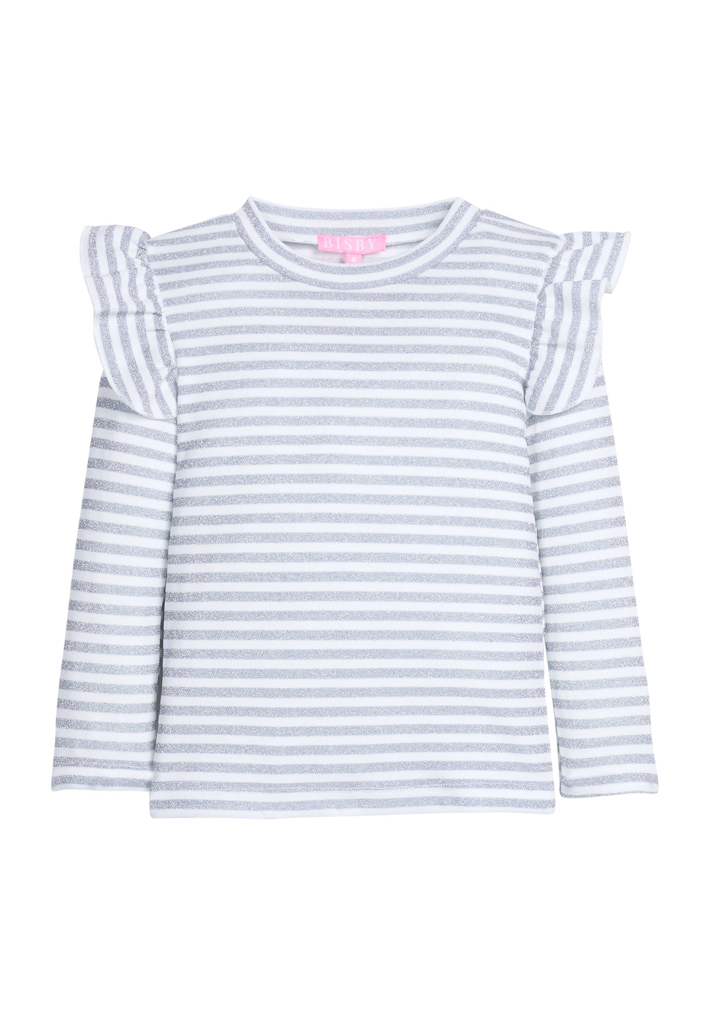 A sparkle of silver and a flutter of fun—this Sadie Top is a tween-approved favorite. Featuring soft silver stripes and sweet ruffle sleeves, it adds just the right amount of shine to everyday style. Pair it with denim, joggers, or a quilted skirt for an effortlessly polished look.