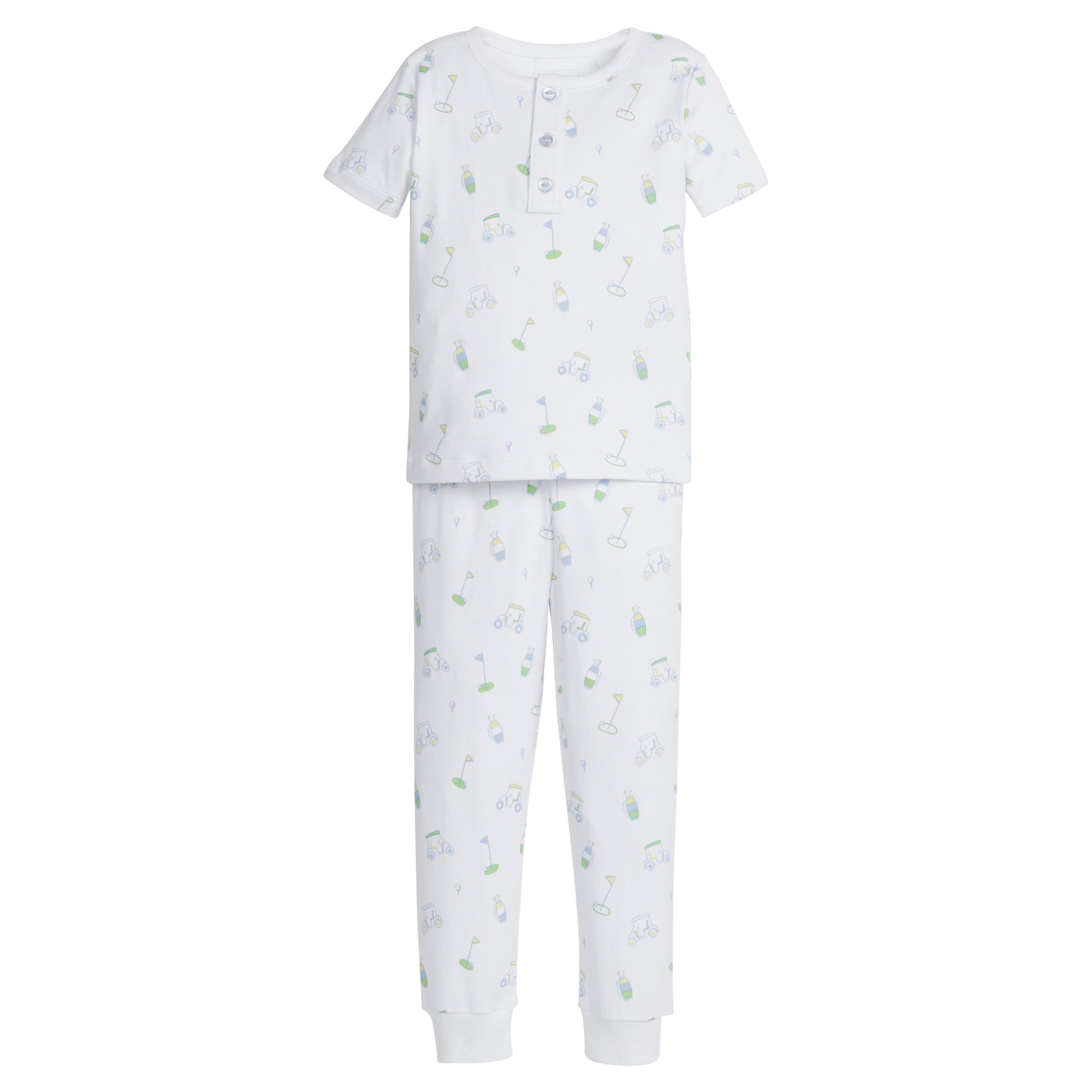 Tee off into dreamland with the Blue Golf Pajamas by Little English! Featuring a fun golf-themed print in soft blue and green, this two-piece pajama set is made from ultra-soft Pima cotton for the coziest sleep. The henley-style top includes a button placket for a classic look, while the matching pants have an elastic waistband and ribbed cuffs for all-night comfort. A timeless set for little golfers in training!