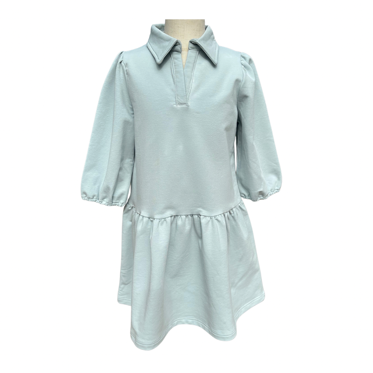 In a soft robin’s egg blue, the Sibley Dress pairs a comfortable scuba-meets-sweatshirt material with a collared neckline and puff sleeves. The drop-waist design adds a playful twist to this wear-anywhere style.