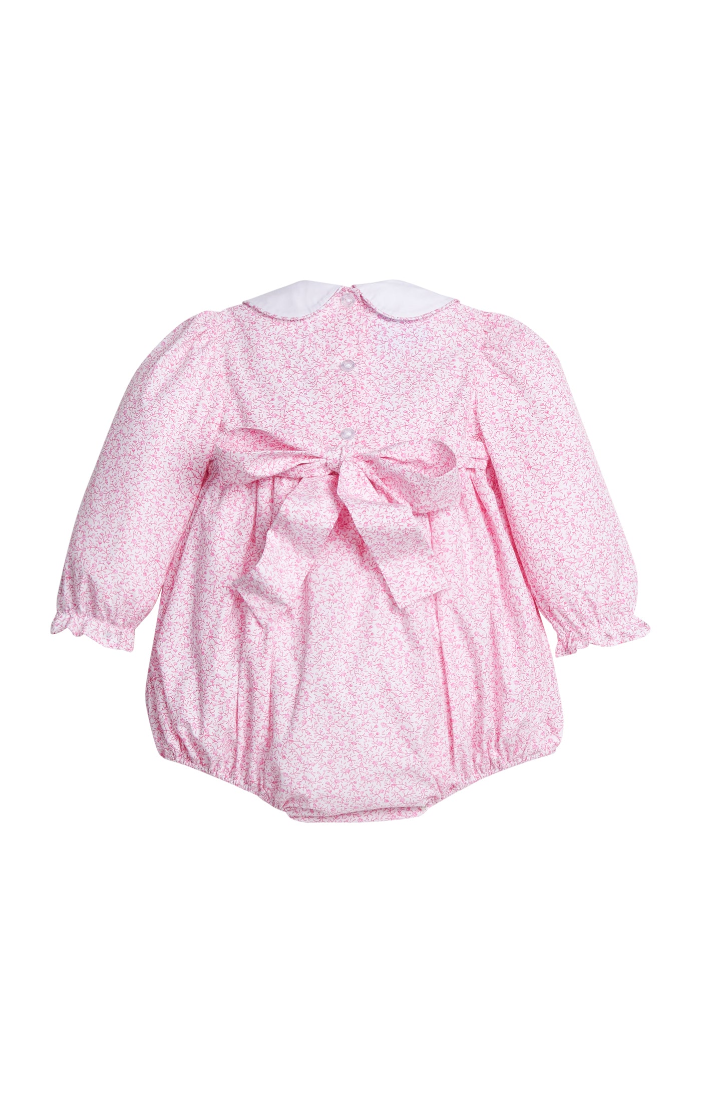 Dainty and darling, the Smocked Natalie Bubble features a delicate Pink Vinings floral print, hand-smocked bows, and a crisp white collar for a sweet and traditional silhouette. The long sleeves and soft fabric make it perfect for cooler days, and the back sash adds a charming touch. Coordinate with the matching dress for classic sibling style.