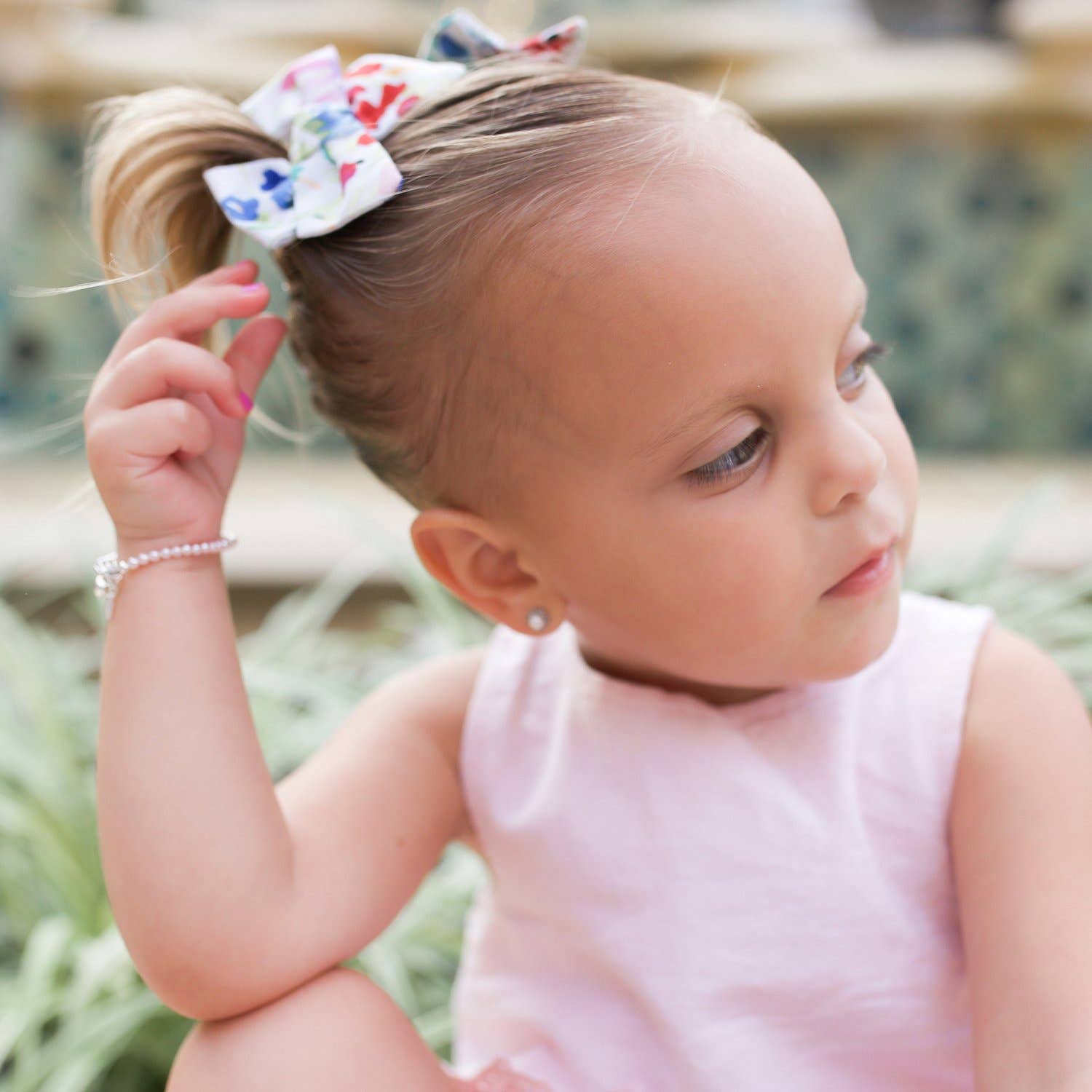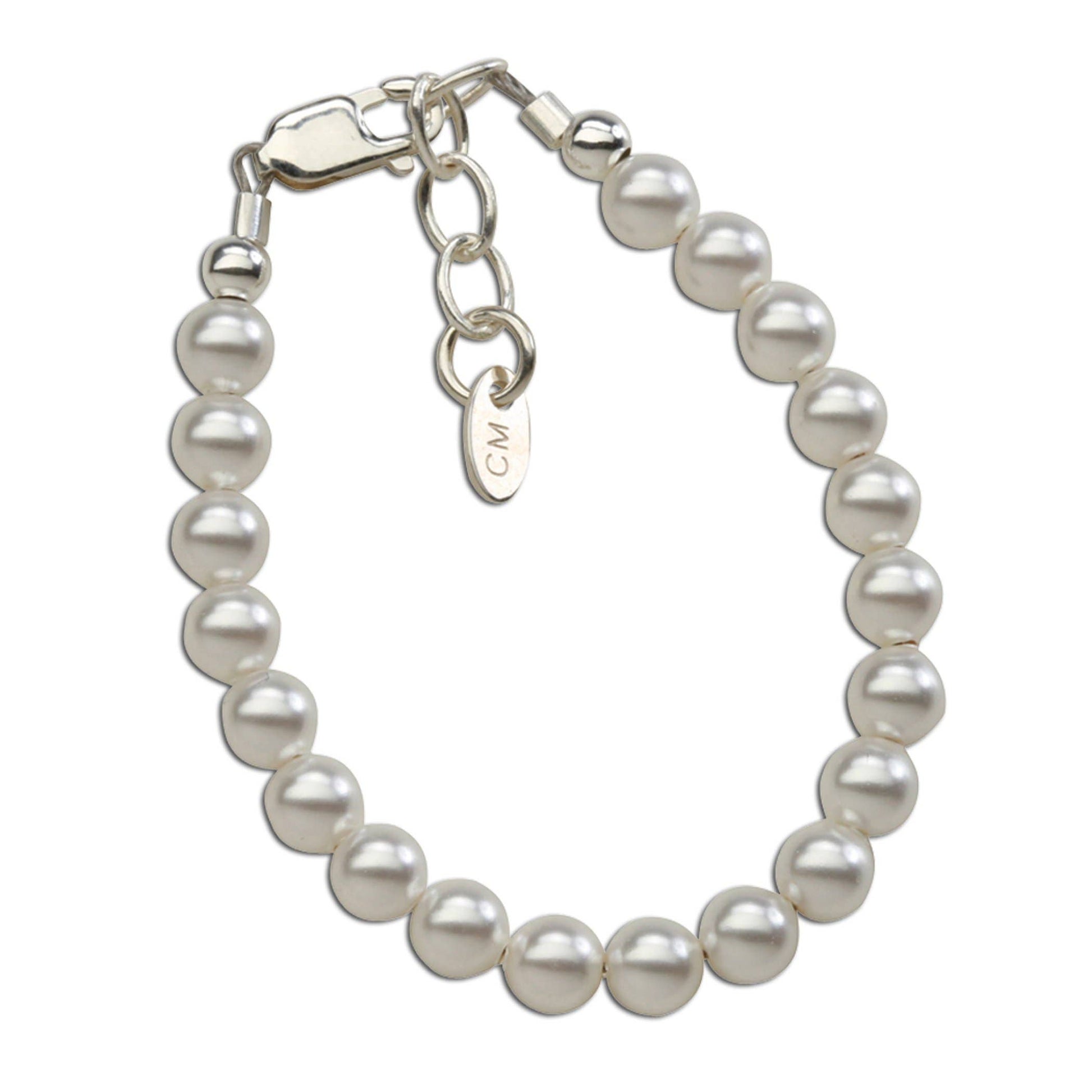 Her first Pearls! Simply beautiful sterling silver bracelet featuring a strand of gorgeous high-end simulated pearls. This looks beautiful for flower girls or Jr. Bridesmaid and is a timeless keepsake that makes a perfect baby gift, flower girl gift, or her first pearls! Each bracelet has an extension chain, so as the child grows you just move to the next link for a perfect fit. This bracelet is available in three sizes and is great for infants, babies, toddlers, and kids.