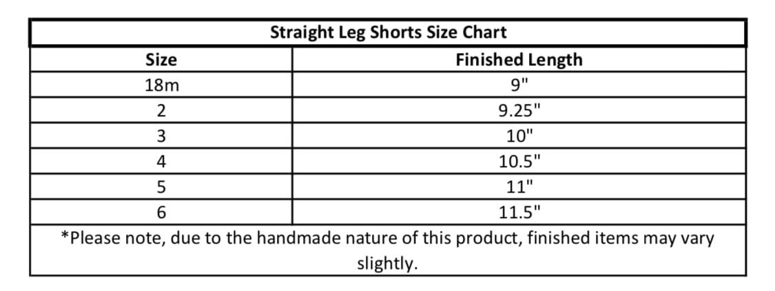 Our Straight Leg Shorts run true to size. Size 2 will have a wider leg to accommodate a diaper.