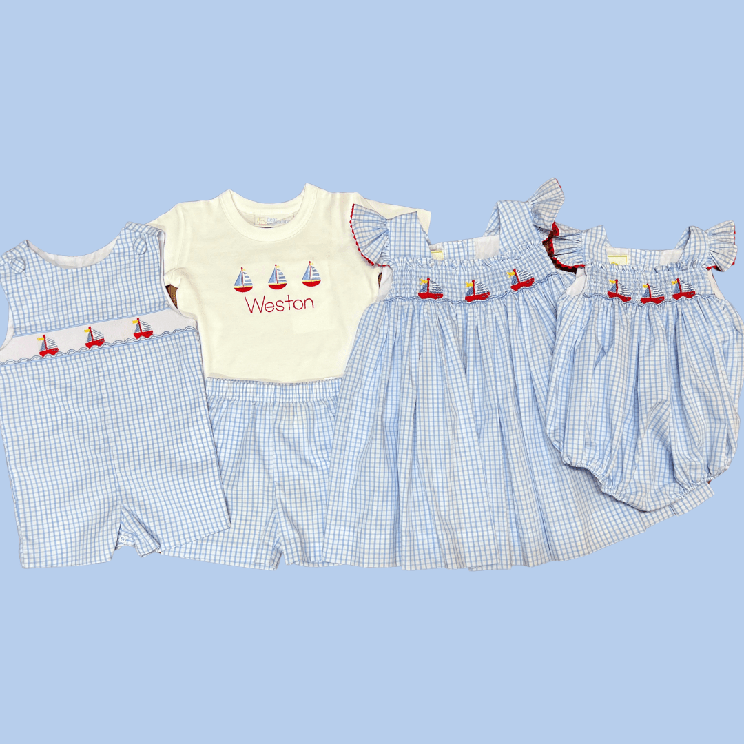 This Summer Sailboats Shirt features a playful trio of mini sailboats in red, white, and blue. Perfect for young boys, this summer shirt is both stylish and comfortable, making it a must-have for warm weather activities. Let your child's imagination embark on a sailing adventure in this fun and versatile shirt. Shown here with Blue Windowpane Leo Shorts from Zuccini.