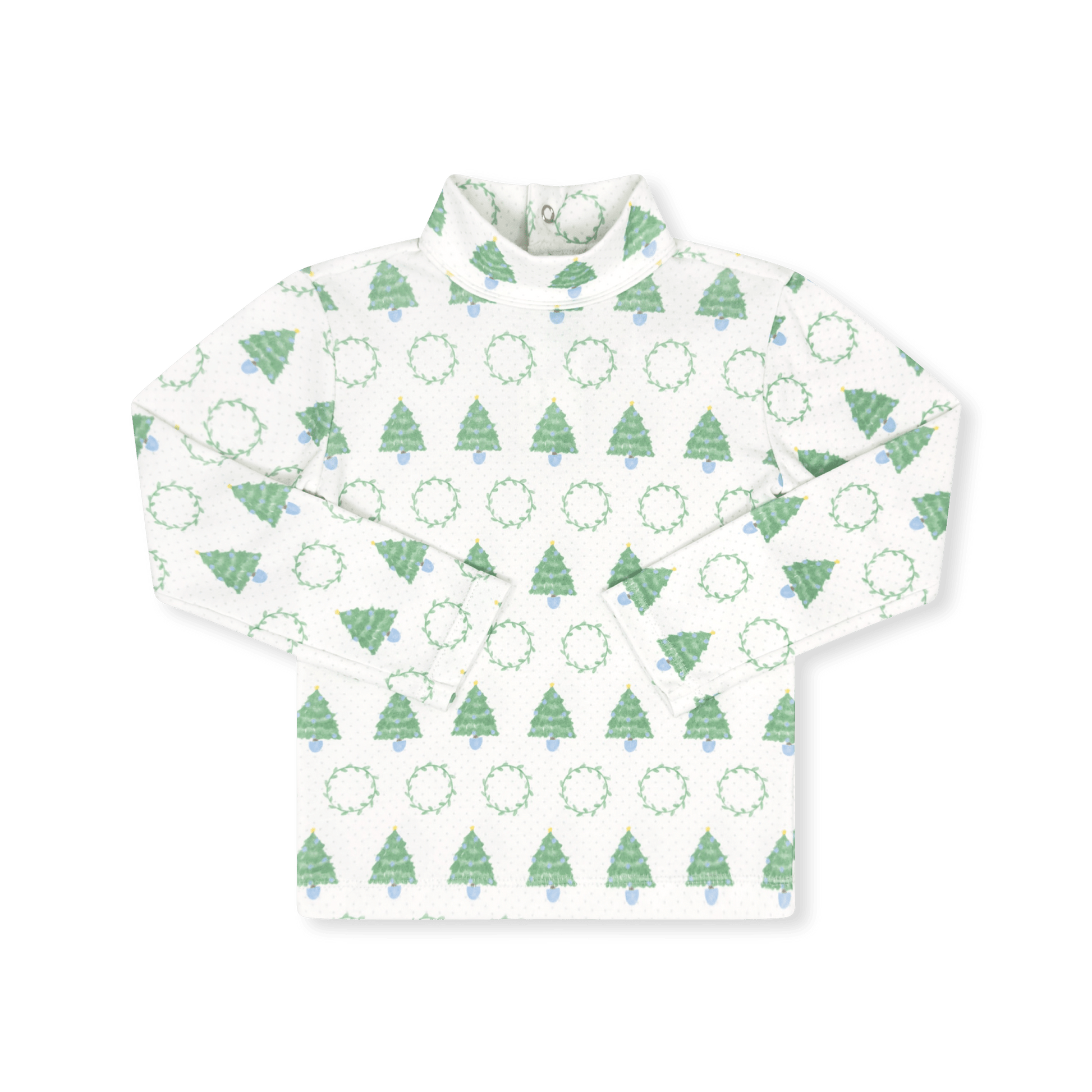 Celebrate the holiday spirit with this adorable turtleneck, featuring a playful all-over print of Christmas trees and wreaths. The high collar provides extra warmth, making it perfect for layering under sweaters or dresses during the festive season.