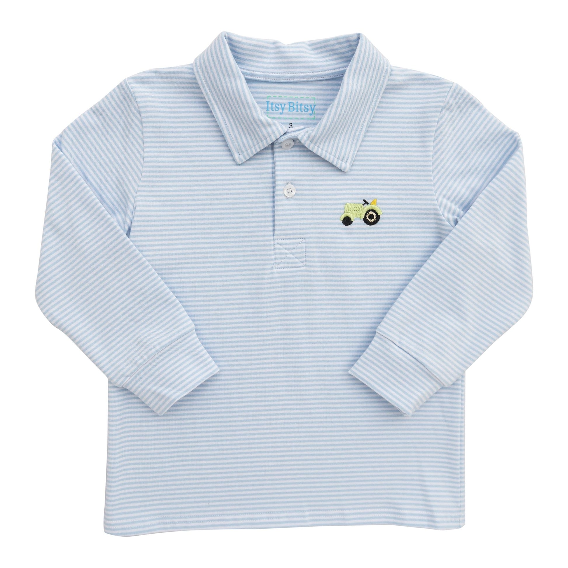A classic collared style with a playful twist — this striped polo is accented with an embroidered green tractor. Perfect for school days, playdates, and everything in between.