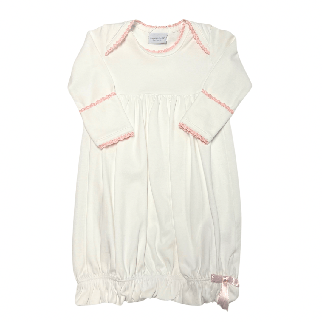 This is a sweet and classic Squiggles baby lap shoulder gown, featuring delicate pink crochet trim and a charming bow detail. Made from soft, breathable pima cotton, this gown ensures comfort for your little one, making it perfect for snuggling and sleeping. The lap shoulder design allows for easy dressing, while the gown's elastic hem ensures a snug and cozy fit. A beautiful choice for newborns and a thoughtful baby gift!