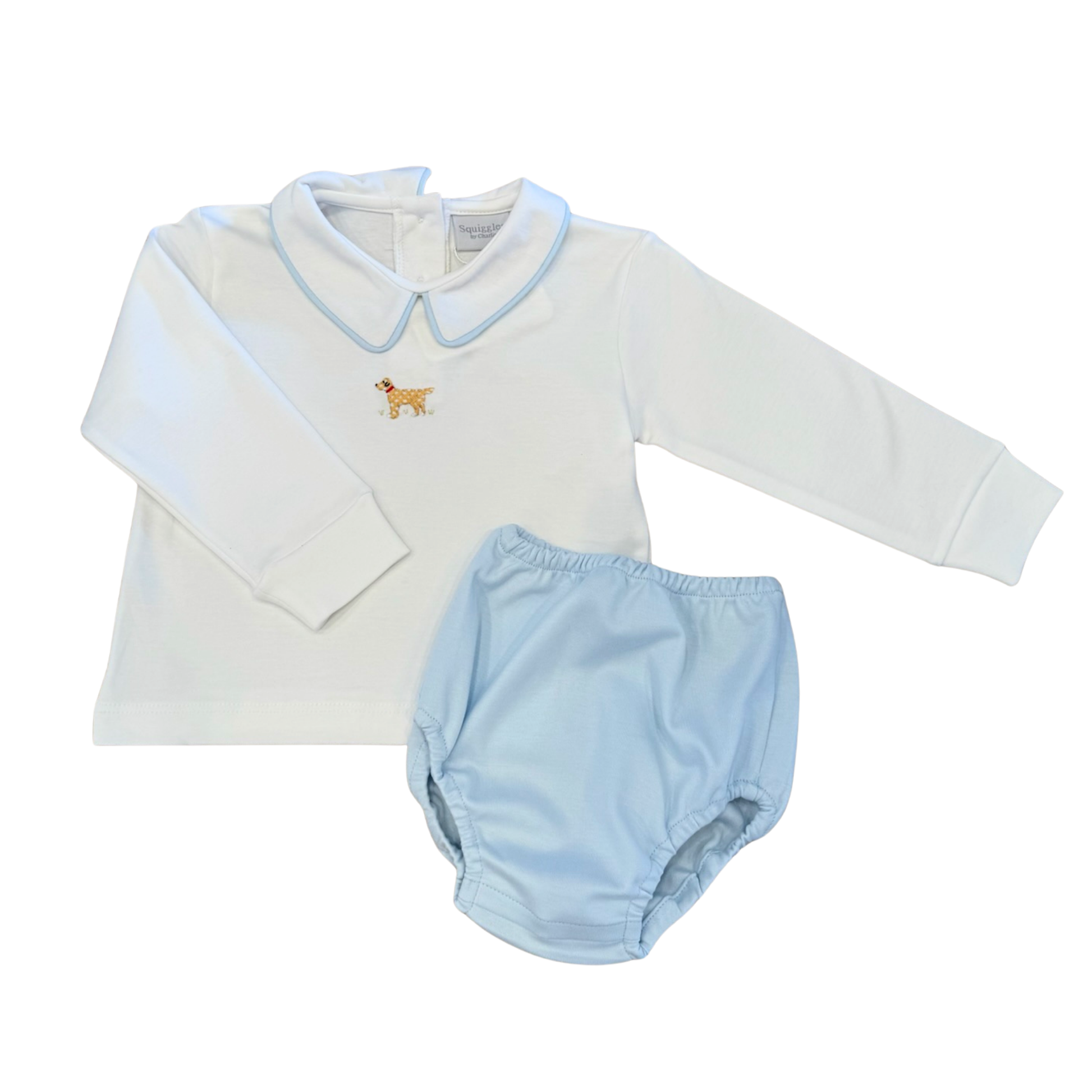 A little pup and a lot of charm! Our Winston Puppy Diaper Set is made with buttery Peruvian Pima Cotton for ultimate softness. The top features an embroidered puppy with a blue piped Peter Pan collar and coordinating blue bloomers. An adorable classic for your littlest boy!