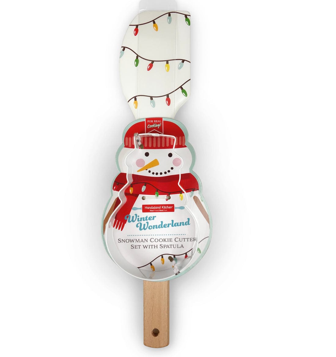 Includes: 1 snowman stainless steel cookie cutter and 1 printed silicone spatula.