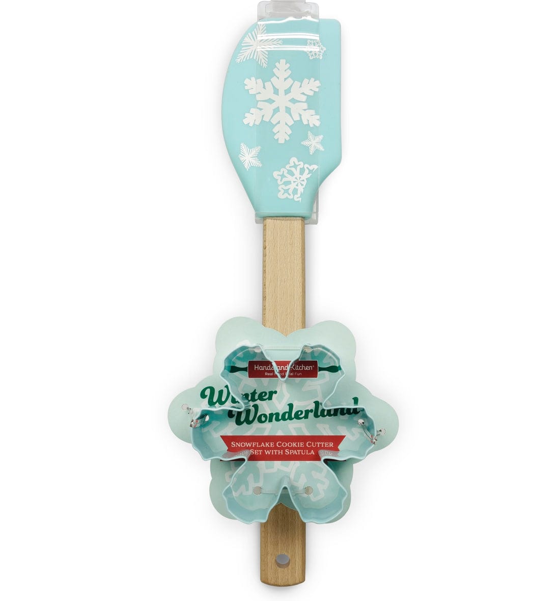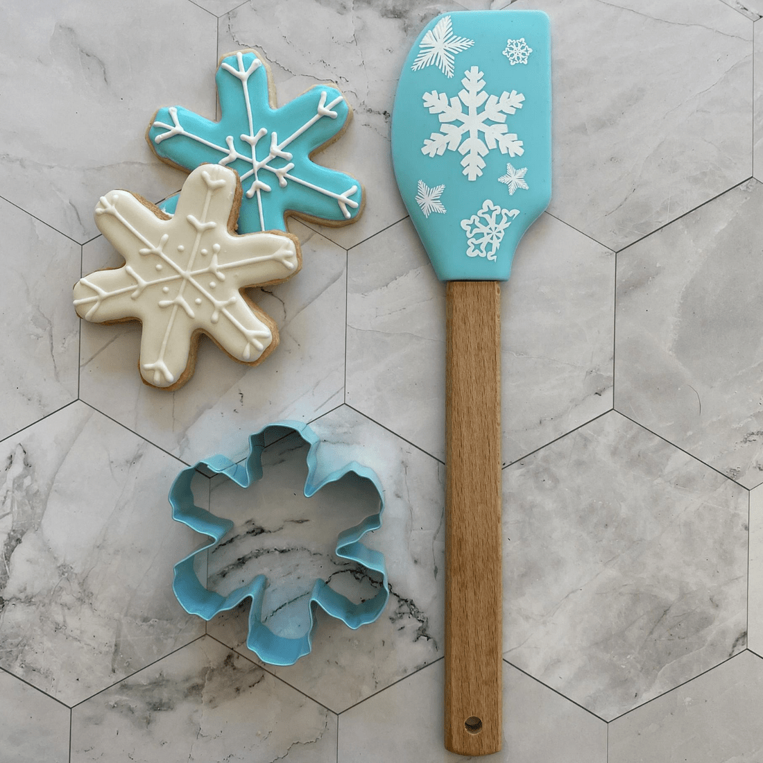 Includes: 1 snowflake stainless steel cookie cutter and 1 snowflake-printed silicone spatula.