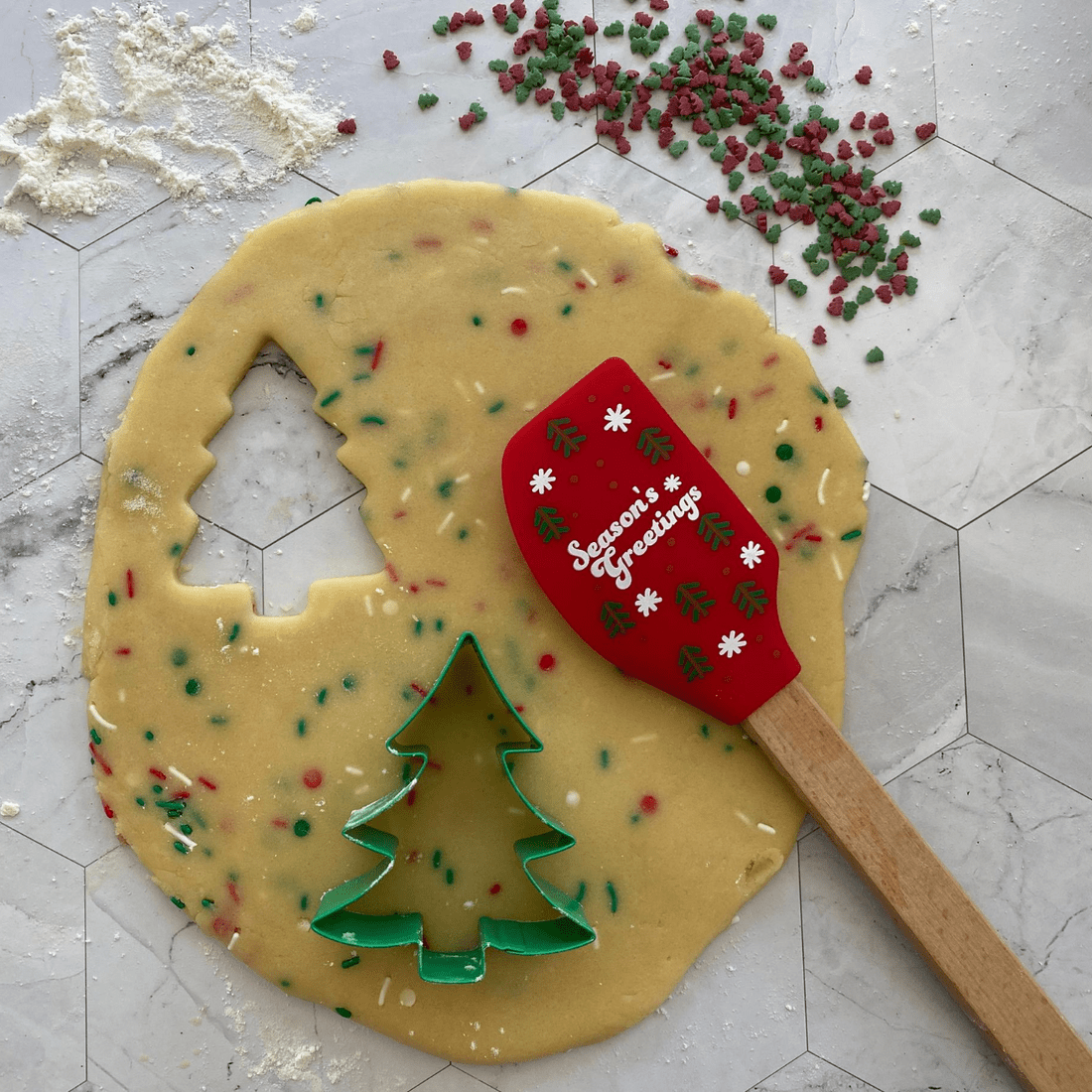 Includes: 1 tree stainless steel cookie cutter and 1 “Seasons Greetings” silicone spatula.